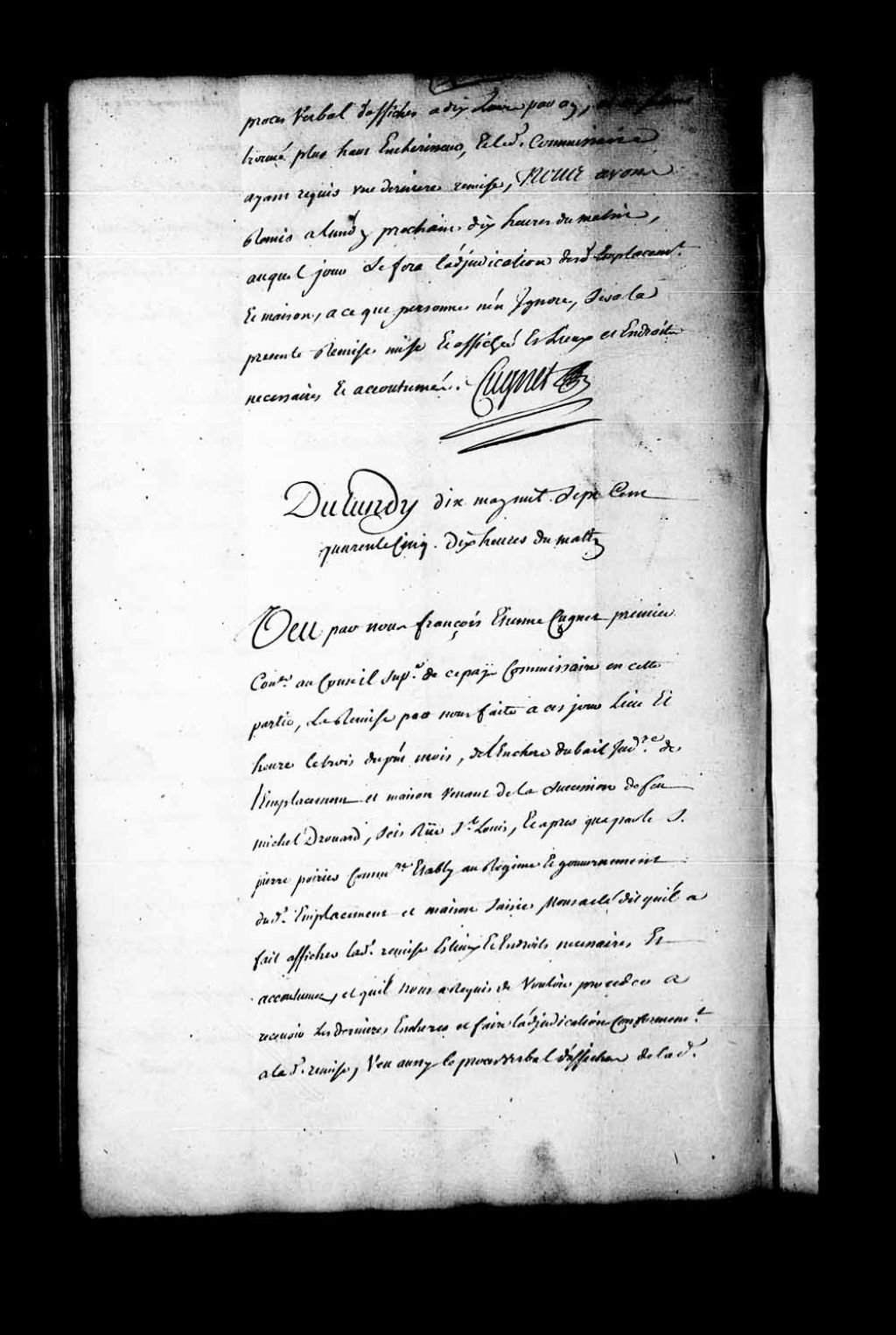 Procès-verbal de François-Etienne Cugnet, conseiller en ce Conseil, qui fait une dernière remise à quinzaine de l'adjudication de l'emplacement et maison saisis par feu Michel Sarrazin sur feu Michel Drouard, 10 mai 1745, Archives nationales à Québec, Fonds Conseil souverain, (03Q,TP1,S28,P19781).