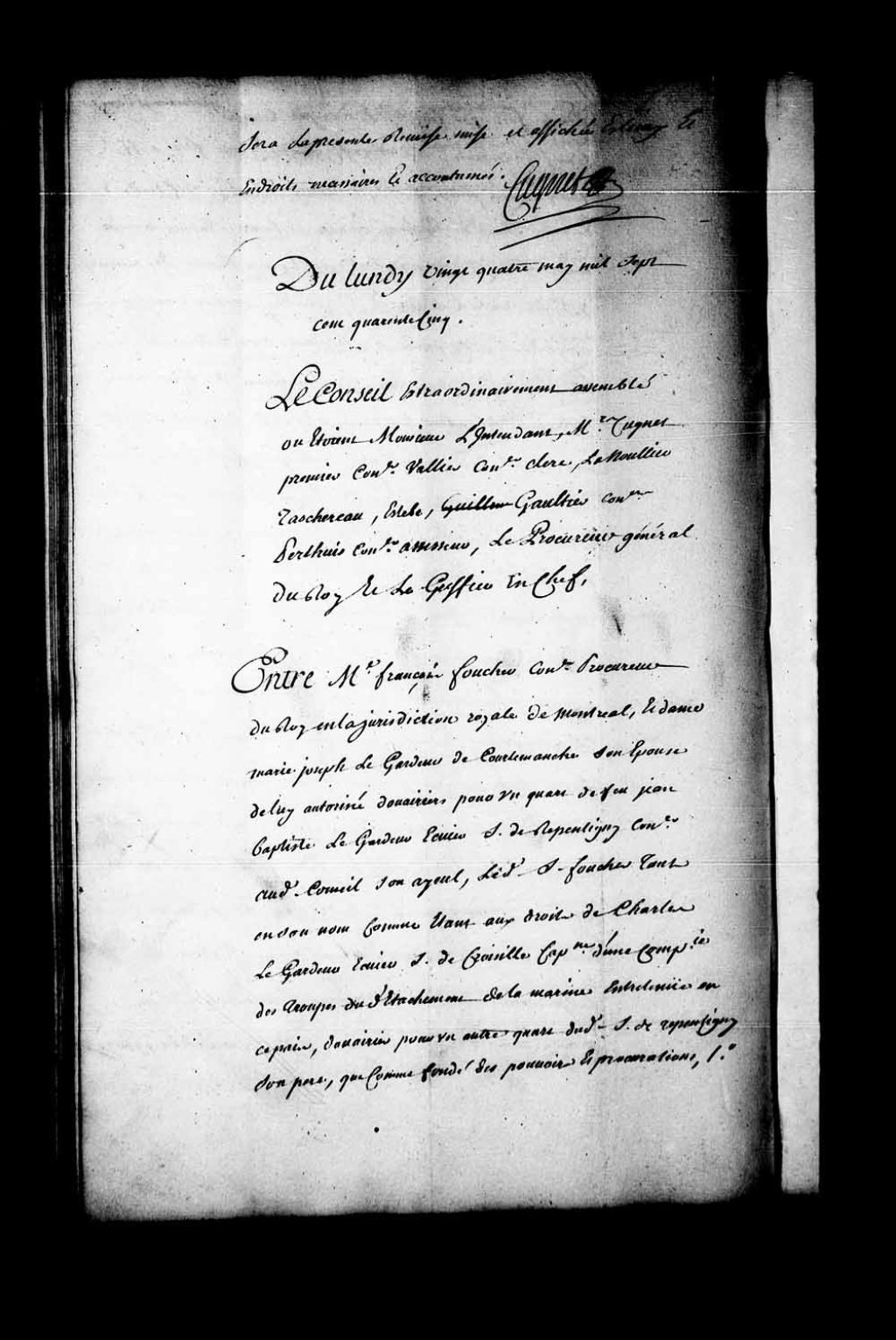 Arrêt dans la cause entre François Foucher, procureur du Roi de Montréal, époux de Marie-Joseph Legardeur de Courtemanche, douairière pour un quart de feu Jean-Baptiste Legardeur de Repentigny, conseiller au Conseil Souverain, son aïeul, le dit Foucher, étant aux droits de Charles Legardeur de Croisille, douairier pour un quart du sieur de Repentigny, son père que comme fondé de pouvoir, dame Agathe de Saint-Père, veuve de Pierre Legardeur de Repentigny et tutrice de ses petits enfants, les dits mineurs ayant un quart dans le quart revenant au dit feu Legardeur de Repentigny, leur aïeul, et autres bénéficiaires (voir acte), contre dame Geneviève de Ramezay, veuve de Henri Deschamps de Boishébert, seigneur de la Bouteillerie, capitaine dans les troupes, comme tutrice de ses mineurs, et autres contestataires (voir acte). Le Conseil a disjoint la demande de la dame veuve Bouat au sujet d'un fief faisant partie de son adjudication, du 17 juillet 1742. Le Conseil, faisant droit sur l'appel appointé par arrêt du 2 septembre 1743, a mis l'appel à néant en ce qu'il est ordonné que les intimés, comme exerçant les droits de feue Marguerite Nicolet, veuve de feu Jean-Baptiste Legardeur de Repentigny, leur débitrice, seront payés acompte de leurs créances de la somme de 1 900 livres. Le dit Foucher est condamné solidairement avec Guillaume Beaudoin, gardien de la saisie réelle de la seigneurie de Repentigny, à compter les fruits et revenus de la dite seigneurie depuis et compris l'année 1731 jusqu'au jour de la dite adjudication, 24 mai 1745, Archives nationales à Québec, Fonds Conseil souverain, (03Q,TP1,S28,P19782).