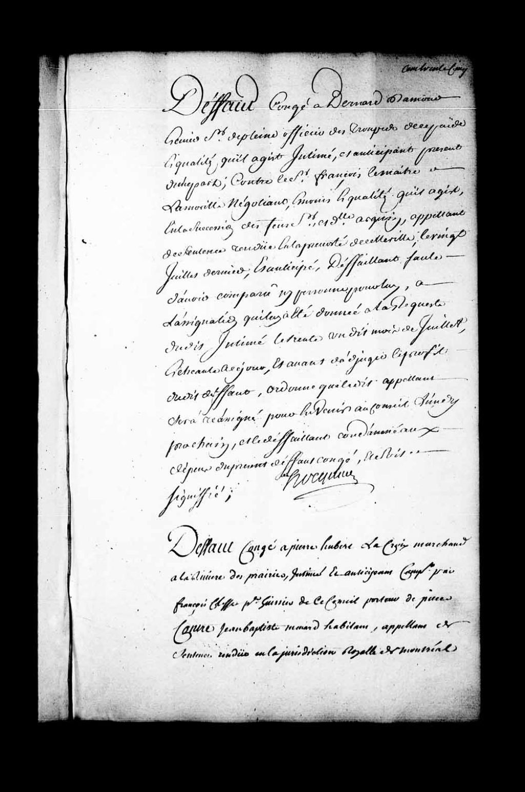 Arrêt qui accorde défaut-congé à Pierre Hubert Lacroix, marchand à la Rivière-des-Prairies, contre Jean-Baptiste Ménard, habitant et appelant de la sentence rendue en la Juridiction de Montréal, le 9 juillet 1745, 9 août 1745, Archives nationales à Québec, Fonds Conseil souverain, (03Q,TP1,S28,P19809).