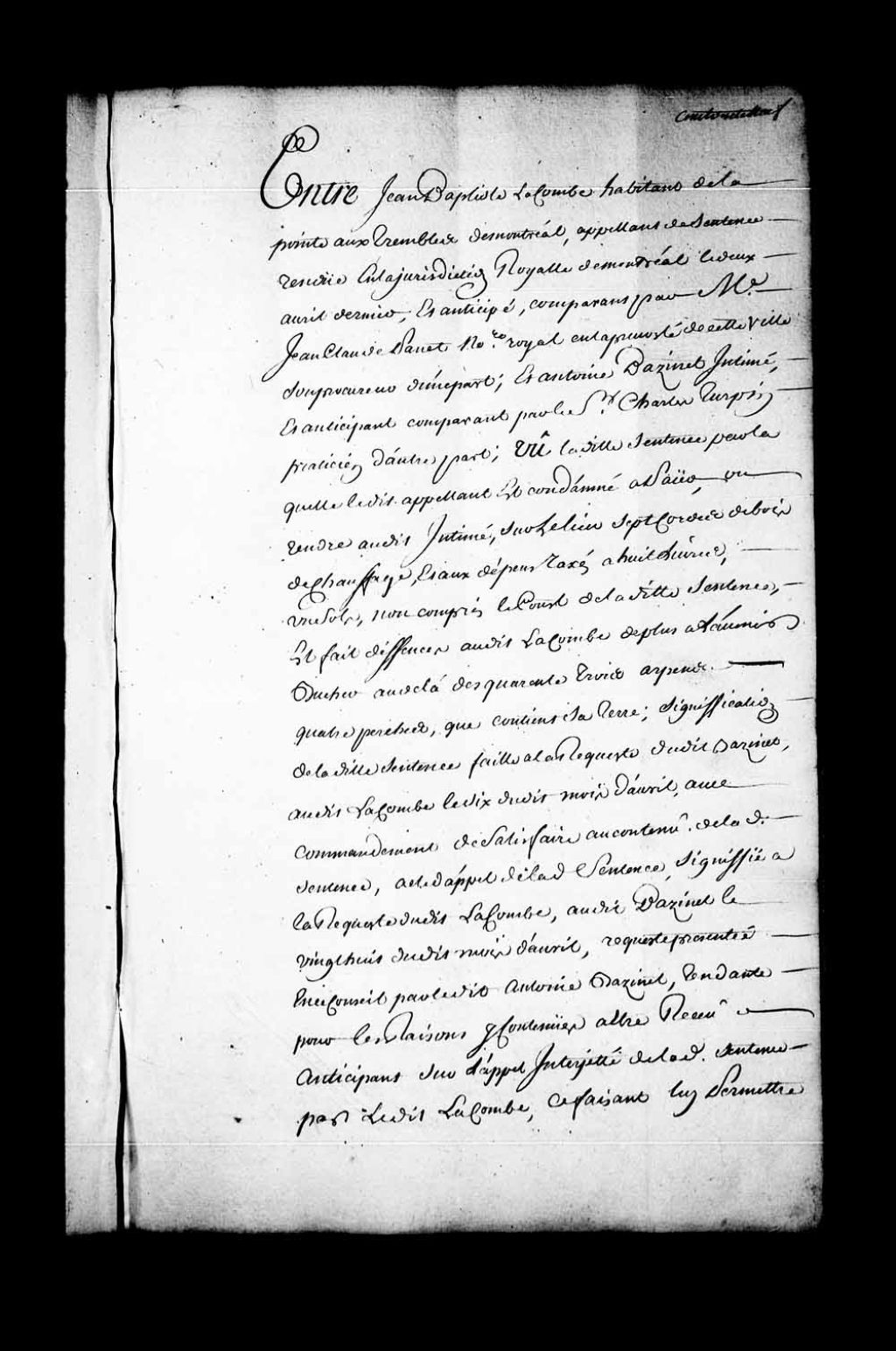 Appel mis à néant de la sentence rendue en la Juridiction de Montréal, le 2 avril 1745, dans la cause entre Jean-Baptiste Lacombe, habitant de la Pointe-aux-Trembles de Montréal, contre Antoine Bazinet, comparant par Charles Turpin, praticien. Jean-Baptiste Lacombe est condamné à l'amende de 3 livres pour son «fol appel», 16 août 1745, Archives nationales à Québec, Fonds Conseil souverain, (03Q,TP1,S28,P19811).