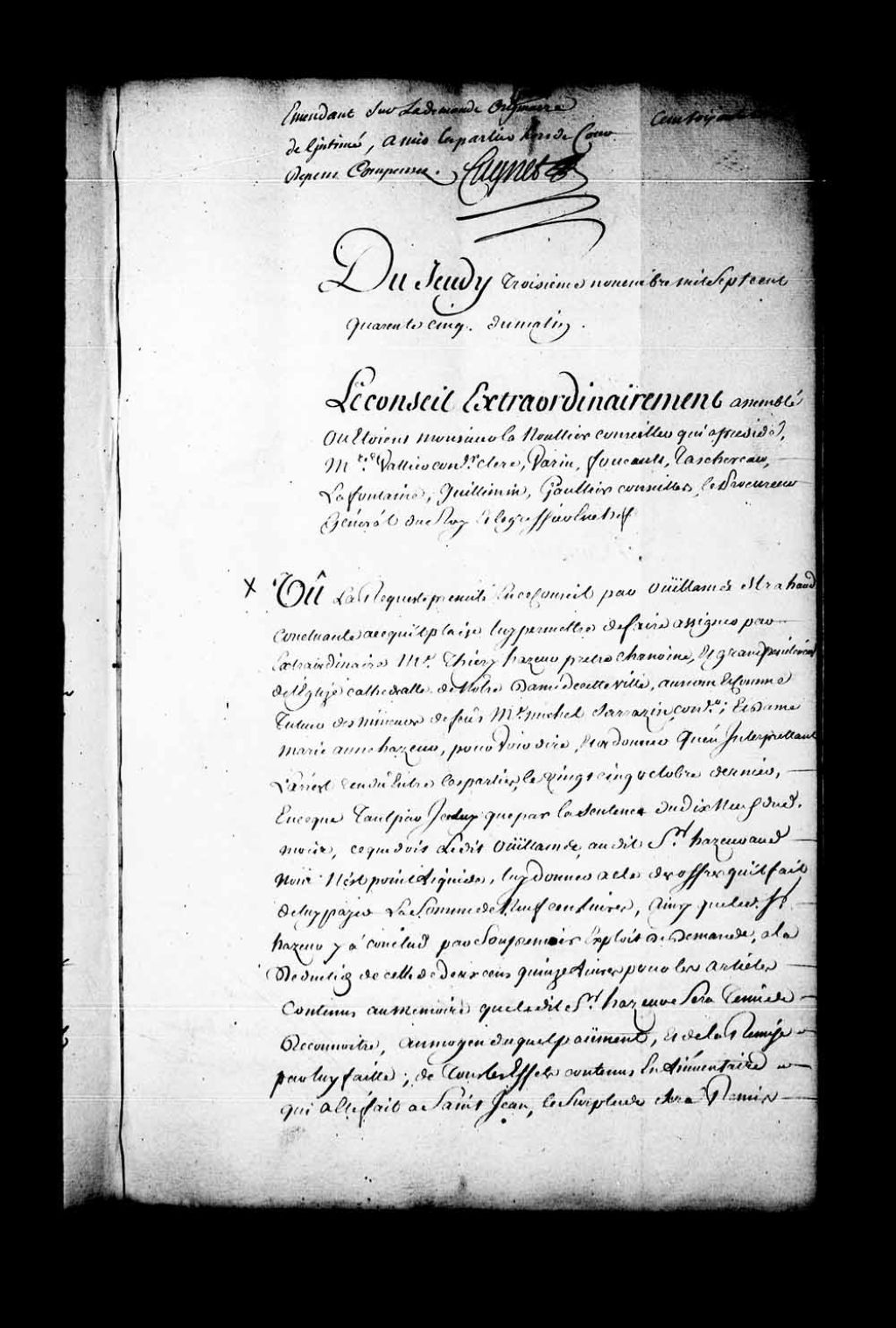 Arrêt qui renvoie les parties à l'exécution de l'arrêt rendu par le Conseil, le 25 octobre1745, dans la cause entre Guillaume Stroud contre monsieur Hazeur, chanoine et grand pénitencier de la cathédrale de Québec, au nom et comme tuteur des mineurs de Michel Sarrazin et de Marie-Anne Hazeur, 13 novembre 1745, Archives nationales à Québec, Fonds Conseil souverain, (03Q,TP1,S28,P19832).