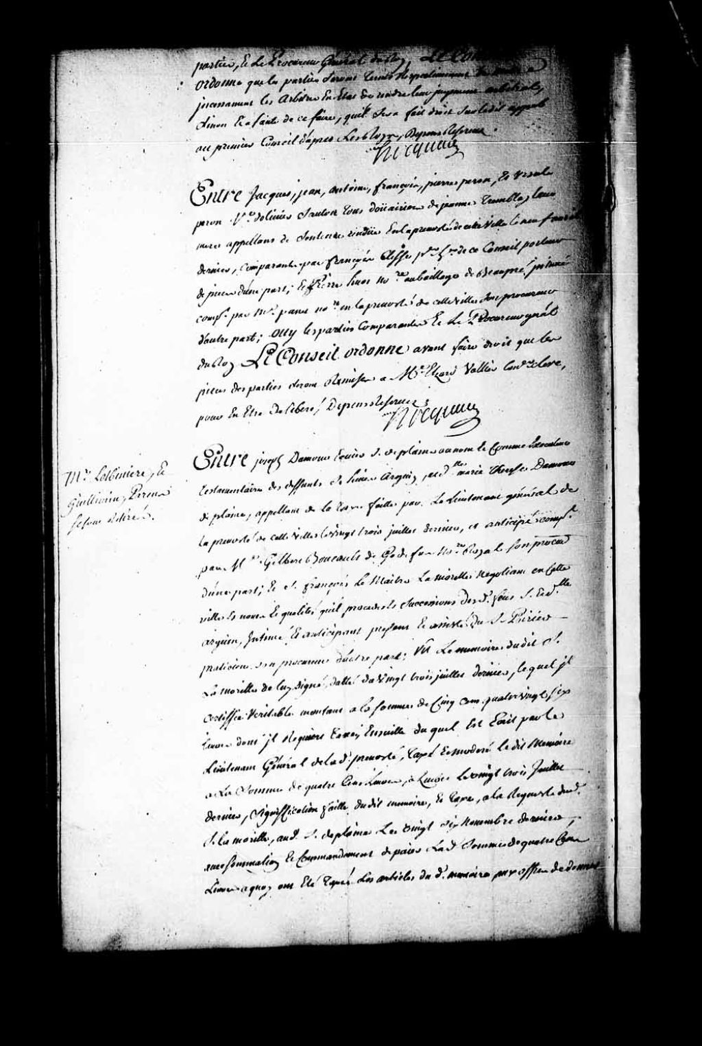 Arrêt qui ordonne, avant de faire droit, que les pièces des parties seront remises au sieur Elzéar Vallier, conseiller clerc, pour en être délibéré dans la cause entre Jacques, Jean, Antoine, François, Pierre et Ursule Perron, veuve d'Olivier Sauton, tous douairiers de Jeanne Tremblay, leur mère, appelants de la sentence rendue en la Prévôté de Québec, le 9 avril 1745, contre Pierre Huot, notaire au bailliage de Beaupré, 20 décembre 1745, Archives nationales à Québec, Fonds Conseil souverain, (03Q,TP1,S28,P19857).
