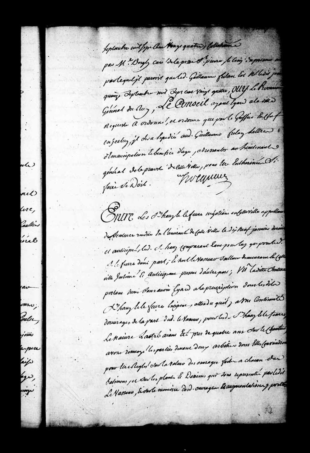 Arrêt dans la cause entre les sieurs Havy et Lefebvre, négociants à Québec, appelants de la sentence rendue en l'Amirauté de Québec, le 19 janvier 1746, contre Noël Levasseur, sculpteur de Québec. Appel mis à néant et, émendant, le Conseil a réduit et modéré le mémoire du sieur Levasseur à la somme de 1 362 livres pour les travaux faits par lui sur les navires L'Imprévue, Saint-Louis, L'Union, Le Centaure, L'Expérience, L'Astrée, 7 mars 1746, Archives nationales à Québec, Fonds Conseil souverain, (03Q,TP1,S28,P19881).