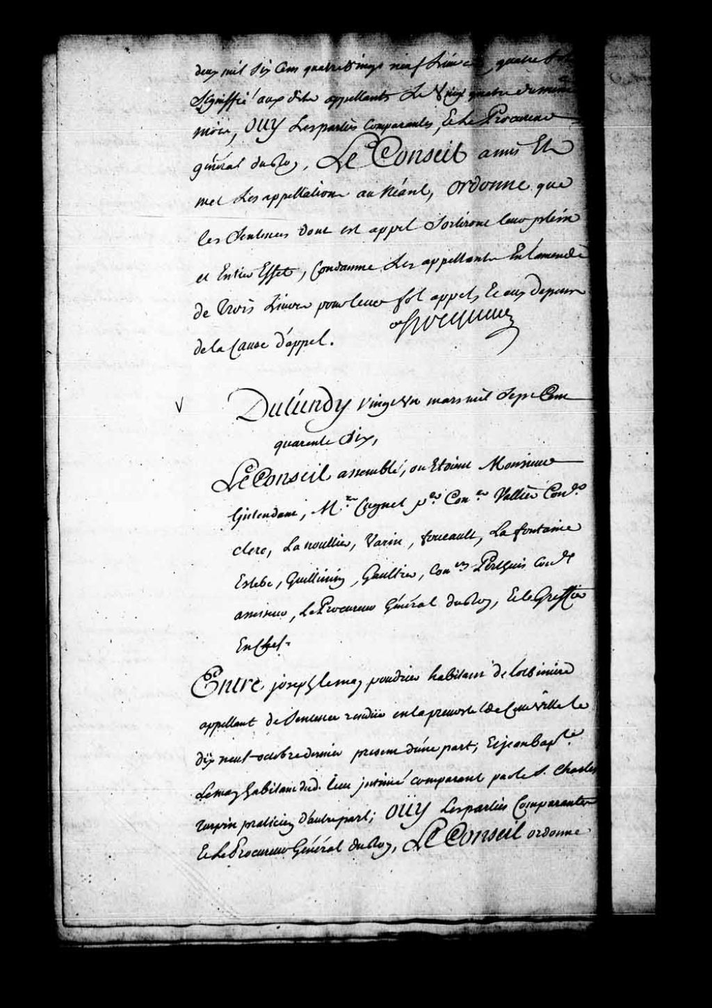 Arrêt qui ordonne, avant de faire droit, que Jean-Baptiste Lemay, habitant de Lotbinière, sera entendu en personne dans sa cause contre Joseph Lemay Poudrier, habitant de Lotbinière, 21 mars 1746, Archives nationales à Québec, Fonds Conseil souverain, (03Q,TP1,S28,P19885).
