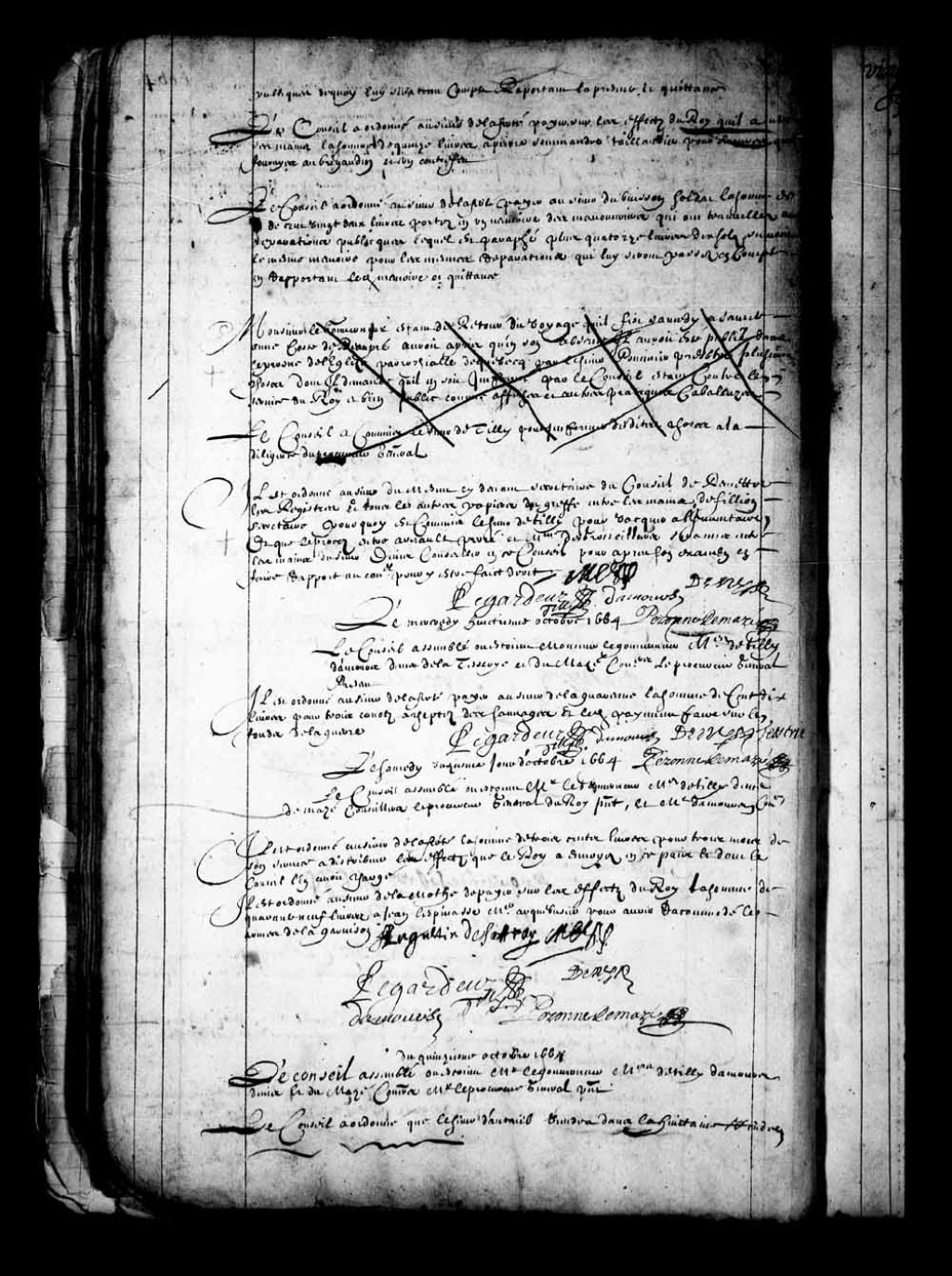Arrêt portant ordre au sieur du Mesnu, secrétaire du Conseil, de remettre les registres et tous autres papiers du greffe à Michel Fillion, secrétaire, et commission au sieur de Tilly pour vaquer à l'inventaire et que le procès entre Arnault Perré et Madame DesGrosseilliers soit remis entre les mains du sieur Denis, conseiller, 1er octobre 1664, Archives nationales à Québec, Fonds Conseil souverain, (03Q,TP1,S28,P199).