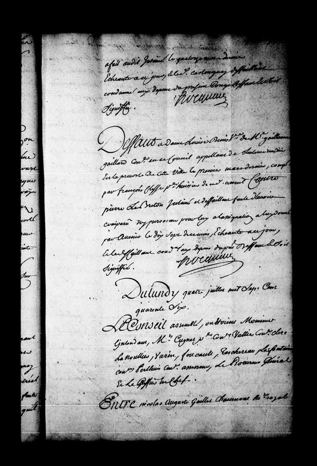 Arrêt qui accorde défaut à Louise Denys, veuve de Guillaume Gaillard, conseiller en ce Conseil, appelante de la sentence rendue en la Prévôté de Québec, le 1er mars 1746, contre Pierre Le Breton