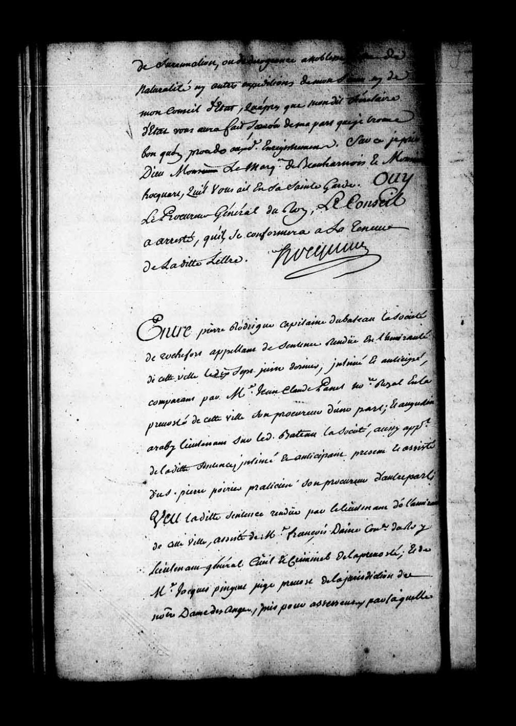 Appel mis à néant de la sentence rendue en l'Amirauté de Québec, le 17 juin 1746, dans la cause entre Pierre Rodrigue, capitaine du bateau La Société, de Rochefort, contre Augustin Araby, lieutenant sur le dit bateau et appelant aussi de la dite sentence. Appel d'une sentence de l'Amirauté par laquelle Augustin Araby, Jean Doucet, troisième lieutenant, Pierre Deschamps, voilier, Joseph Allary, charpentier, Joseph Dumarail dit Lafranchise, Jean Saint-Michel, Raymond Fourny, Gabriel Darpoet, Philippe Jouvain, Thomas Gingras et Jean Marie Dabonville, matelots, sont déclarés convaincus savoir le dit Araby avoir désobéi au dit Rodrigue. Pour réparation, le dit Araby a été condamné à 150 livres de dommages. Le Conseil décharge Araby des condamnations prononcées contre lui
