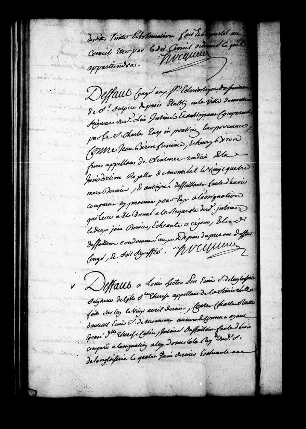 Arrêt qui accorde défaut-congé aux Sieurs Ecclésiastiques du Séminaire de Saint-Sulpice de Paris, établis en la ville de Montréal, seigneurs de la dite île, contre Jean Biron Fresnière et Henri Biron frères, appelants de la sentence rendue en la Juridiction de Montréal, le 24 mars 1746