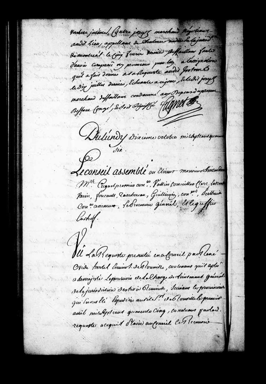 Arrêt qui ordonne, avant de faire droit, qu'il sera fait information des vie et moeurs de René Ovide Hertel de Rouville, à qui il a plu à Sa Majesté de donner la charge de lieutenant général de la Juridiction des Trois-Rivières par provisions du 1er avril 1745, 10 octobre 1746, Archives nationales à Québec, Fonds Conseil souverain, (03Q,TP1,S28,P19989).