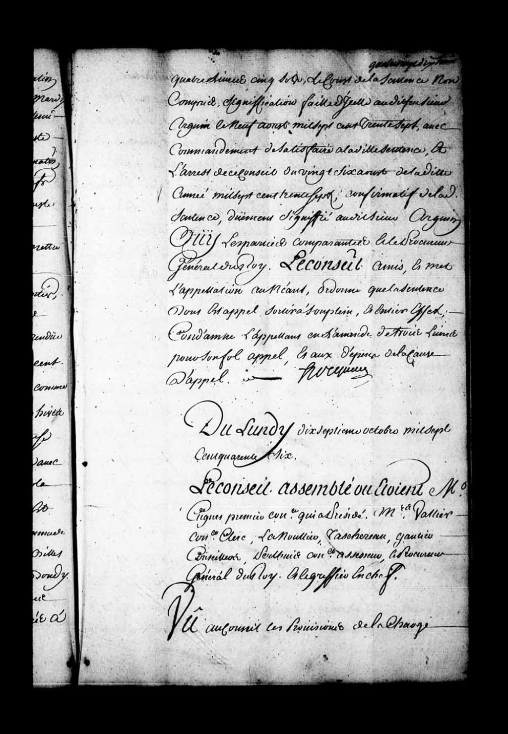 Arrêt qui reçoit René-Ovide Hertel de Rouville en la charge de lieutenant général de la Juridiction des Trois-Rivières, en remplacement de M. de Courval, décédé, après information de vie et moeurs faite devant François-Etienne Cugnet, premier conseiller et certificat de catholicité délivré par M. Jacrau, faisant les fonctions curiales à Québec, 17 octobre 1746, Archives nationales à Québec, Fonds Conseil souverain, (03Q,TP1,S28,P19993).