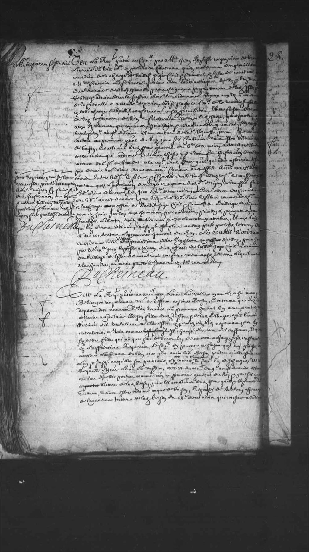 Transcription du texte avec orthographe modernisée : «Vu la requête présentée au Conseil par Monsieur Jean-Baptiste Migeon sieur de Branssat licencié en lois avocat en parlement, contenant qu'en conséquence des provisions à lui accordées de la charge de bailli juge civil et criminel en l'île de Montréal par messire François Lefebvre supérieur des ecclésiastiques d'icelle, et l'un des prêtres du séminaire de Saint-Sulpice de Paris seigneurs propriétaires de ladite île, pour rendre et administrer la justice suivant les ordonnances royaux aux us et coutumes de la prévôté et vicomté de Paris, qu'il plaise au Conseil de le vouloir installer en ladite charge de bailli conformément aux dites provisions, et ce faisant recevoir de lui le serment de bien et fidèlement exercer ladite charge pour par lui en jouir aux honneurs, prérogatives, privilèges et émoluments y annexés, arrêt du trente et unième août dernier étant au bas de ladite requête portant communication du tout au procureur général du Roi pour ses conclusions vues être ordonné ce que de raison, conclusions dudit procureur général du 3e de ce mois, autre arrêt du 6 de ce mois qui ordonne entre autres choses qu'il serait fait information des vie et moeurs dudit sieur de Branssat, à la requête dudit procureur général qui administrerait témoins par-devant le sieur Damours conseiller commis à cet effet, autre arrêt de ce jour rendu entre lesdits sieurs Lefebvre et Charles Dailleboust écuyer sieur de Musseaux, portant que l'information des vie et moeurs dudit sieur Migeon de Branssat faite par ledit sieur Damours sera rapportée pour icelle vue être procédé à la réception dudit sieur Migeon si faire se doit, information sur vie, moeurs religion catholique, apostolique et romaine dudit Migeon faite par ledit sieur Damours, ledit jour sixième de ce mois. les lettres de provisions du 26e août dernier, par lesquelles ledit sieur Lefebvre commet ledit sieur Migeon à la charge et office de bailli juge civil et criminel du bailliage dudit Montréal pour en jouir par lui aux honneurs, prééminences, privilèges, prérogatives, autorité, franchises, liberté, droits, revenus et émoluments y attribués, et aux gages qui lui seront données, ainsi qu'il est plus au long porté par lesdites lettres, ouï et ce consentant le procureur général du Roi. Le Conseil a ordonné et ordonne lesdites lettres de provisions être registrées au greffe d'icelui pour jouir par ledit maître Jean-Baptiste Migeon dudit office de bailli juge civil et criminel du bailliage de l'île de Montréal conformément aux dites lettres, lequel mandé à la chambre aurait prêté le serment en tel cas requis. DUCHESNEAU.»