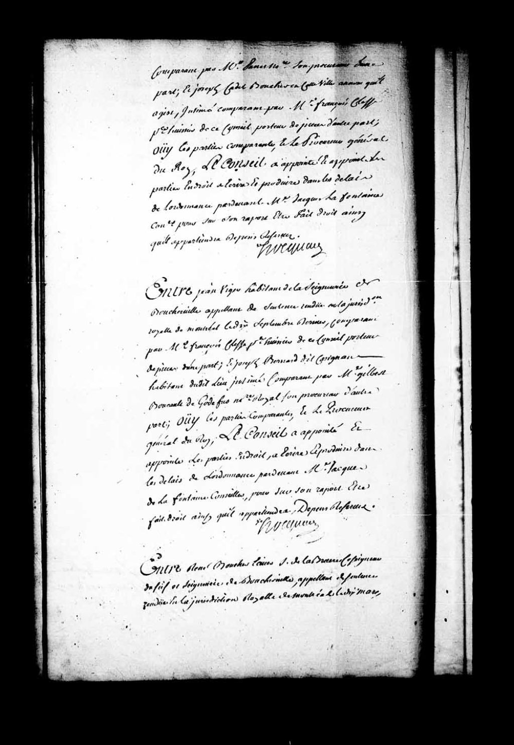 Arrêt qui appointe les parties en droit à écrire et produire, dans les délais de l'ordonnance, devant Jacques de Lafontaine, conseiller, pour que dans son rapport puisse être fait droit ainsi qu'il appartiendra dans la cause entre Jean Viger, habitant de la seigneurie de Boucherville et appelant de la sentence rendue en la Juridiction de Montréal, le 10 septembre 1746, contre Joseph Bernard dit Carignan, habitant du même lieu