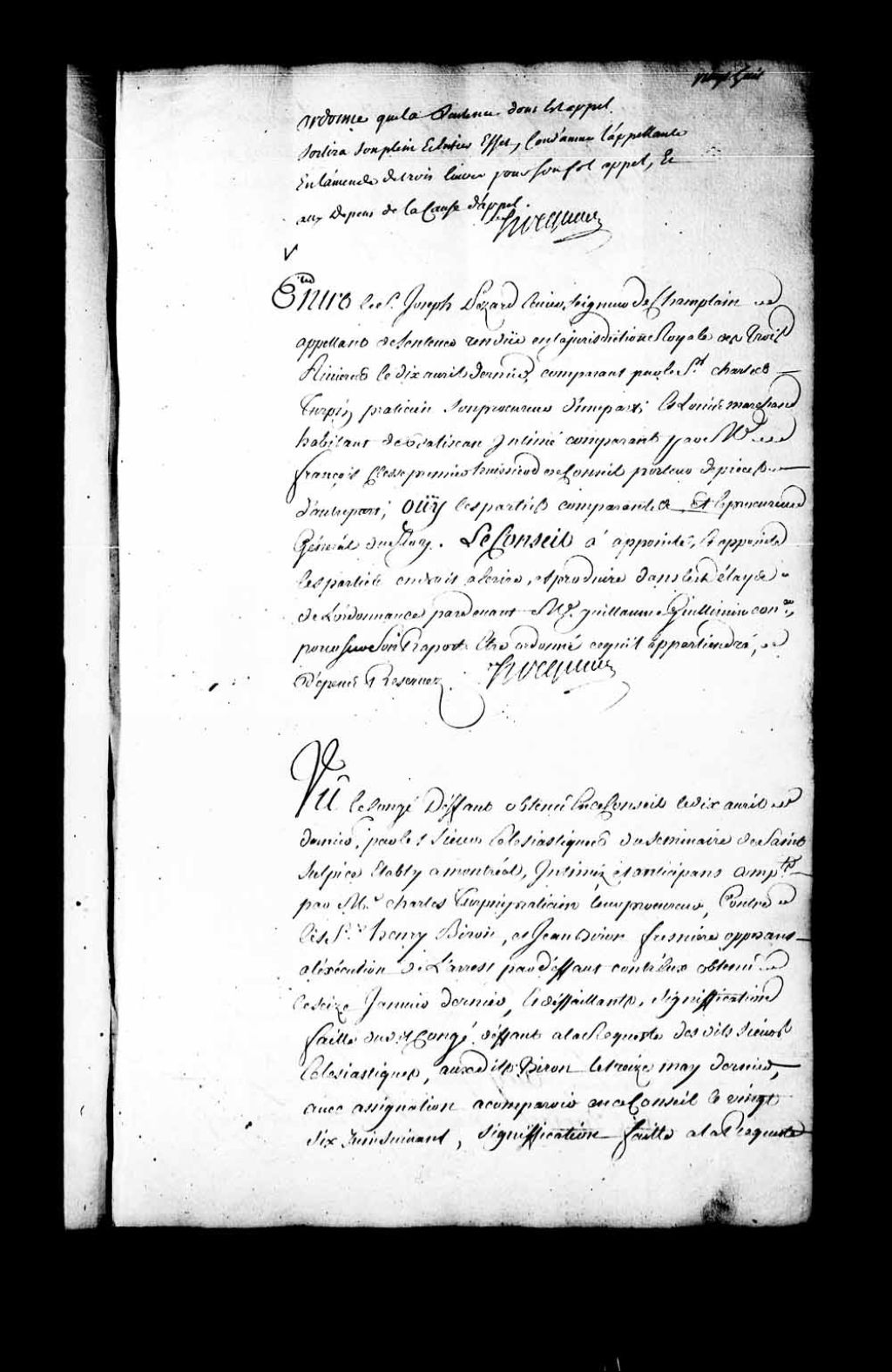 Arrêt qui appointe les parties en droit à écrire et produire, dans les délais de l'ordonnance, devant Guillaume Guillimin, conseiller, pour que dans son rapport puisse être ordonné ce qu'il appartiendra dans la cause entre Joseph Pezard, seigneur de Champlain et appelant de la sentence rendue en la Juridiction des Trois-Rivières, le 10 avril 1747, contre Louis Marchand, habitant de Batiscan, 10 juillet 1747, Archives nationales à Québec, Fonds Conseil souverain, (03Q,TP1,S28,P20092).