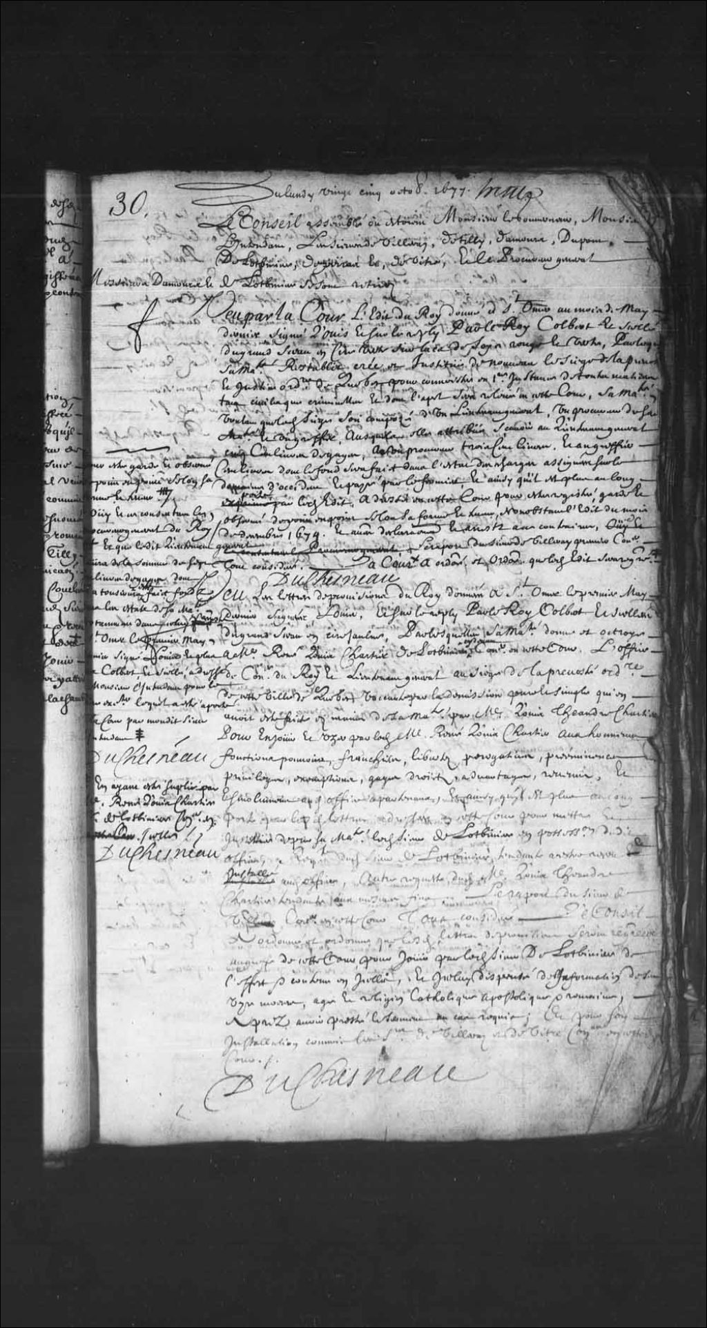 - Transcription du texte avec orthographe modernisée : «Vu les lettres de provisions du Roi données à Saint-Omer le premier mai dernier signées Louis, et sur le repli par le Roi Colbert, et scellées du grand sceau en cire jaune, par lesquelles sa Majesté donne et octroie à maître René Louis Chartier de Lotbinière ci-devant conseiller en cette cour, l'office de conseiller du Roi et lieutenant général au siège de la prévôté ordinaire de cette ville de Québec, vacante par la démission pure et simple qui en avait été faite en les mains de sa Majesté par maître Louis Théandre Chartier, pour en jouir et user par ledit maître René Louis Chartier aux honneurs, fonctions pouvoirs, franchises, libertés, prérogatives, prééminence, privilèges, exemptions, gages, droits et avantages, revenus et émoluments audit office appartenant, et ainsi qu'il est plus au long porté par lesdites lettres adressées en cette cour, pour mettre et instituer de par sa Majesté ledit sieur de Lotbinière en possession dudit office, autre requête dudit maître Louis Théandre Chartier, tendante aux même fins, le rapport du sieur de Villeray conseiller en cette cour tout considéré, le Conseil a ordonné et ordonne que lesdites lettres de provisions seront registrées au greffe de cette cour pour jouir par ledit sieur de Lotbinière de l'effet et contenu en icelles et icelui dispensé de l'information de ses vie et moeurs âge et religion catholique apostolique et romaine; après avoir prêté le serment au cas requis, et pour son installation commis les sieurs de Villeray et de Vitré conseillers en cette Cour. DUCHESNEAU.»