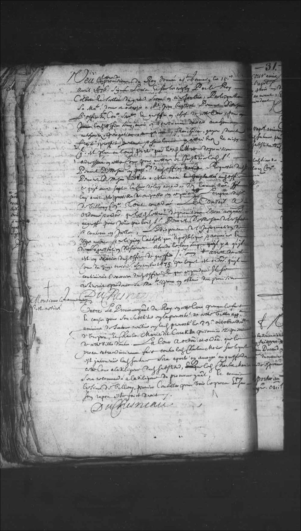 - Transcription du texte avec orthographe modernisée : «Vu les lettres de provisions du Roi données à Saint-Germain le 15 avril 1676, signées Louis, et sur le repli par le Roi Colbert, et scellées du grand sceau en cire jaune, par lesquelles sa Majesté donne et octroie à maître Jean-Baptiste Peuvret de Mesnu l'office de son conseiller secrétaire et greffier en chef de cette cour pour ledit office tenir, avoir et dorénavant exercer aux honneurs, autorités, prérogatives, exemptions, franchises, gages, droits fruits, profits, revenus et émoluments y attribués et ainsi qu'il est plus au long porté par lesdites lettres de provisions adressées à cette cour pour mettre et instituer ledit sieur Peuvret de Mesnu en possession dudit office, requête dudit sieur Peuvret de Mesnu tendante à être reçu audit office ce qu'il aurait supplié la cour de lui accorder des l'année dernière s'il lui avait été possible de repasser en ce pays, arrêt de cette cour du vingt-troisième septembre 1675 par lequel est ordonné qu'il continuerait ledit office, et que cependant il se retirerait par-devant sa Majesté pour en obtenir des provisions, le rapport du sieur de Villeray conseiller, tout considéré, le Conseil a ordonné et ordonne que lesdites lettres de provisions seront registrées au greffe pour jouir par ledit sieur Peuvret de Mesnu de l'effet et contenu en icelles, le dispensant de l'information des vie et moeurs, religion catholique apostolique et romaine et de la prestation du serment, attendu le long temps qu'il y a qu'il est en exercice dudit office de greffier. DUCHESNEAU.»
