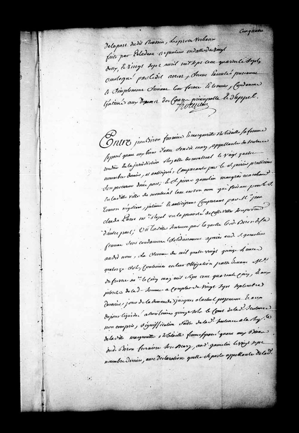 Appel mis à néant dans la cause entre Jean Biron Fresnière et Marguerite Robitaille, sa femme, séparée quant aux biens d'avec son mari, appelants de la sentence rendue en la Juridiction de Montréal, le 24 novembre 1747, contre Pierre Gamelin Maugras, marchand de Montréal, tant en son nom que comme faisant pour le sieur Touron, négociant, comparant par Jean Claude Panet. Fresnières et Robitaille sont condamnés à l'amende de 3 livres pour leur «fol appel» et aux dépens de la cause d'appel, 22 avril 1748, Archives nationales à Québec, Fonds Conseil souverain, (03Q,TP1,S28,P20179).