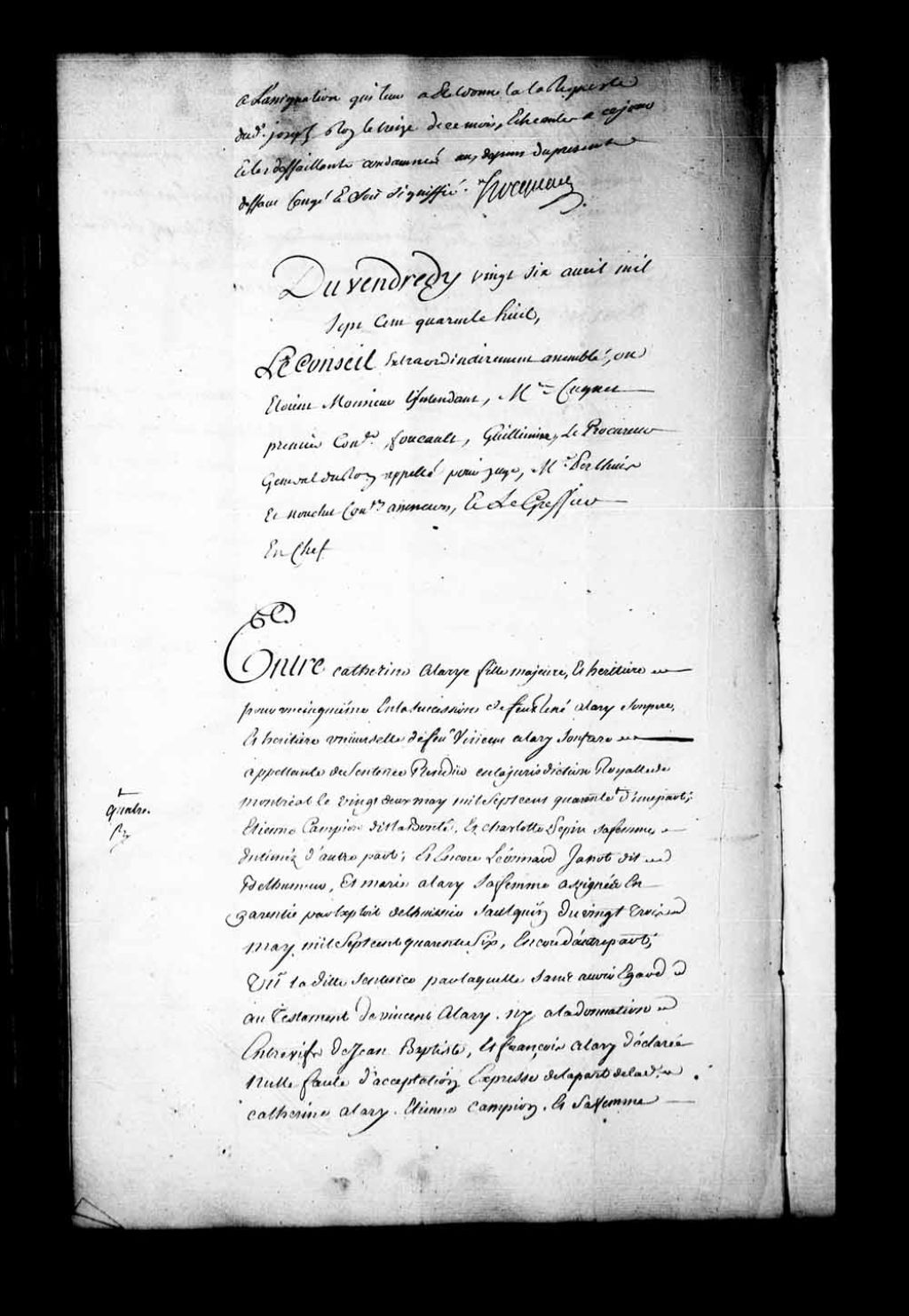 - Arrêt qui accorde défaut-congé à Joseph Roy, capitaine de miliArrêt dans la cause entre Catherine Alary, fille majeure, héritière pour un cinquième en la succession de feu René Alary, son frère, appelante de la sentence rendue en la Juridiction de Montréal, le 22 mai 1744, contre Etienne Campion dit Labonté et Charlotte Pepin, sa femme, et encore Léonard Janot dit Bellehumeur et Marie Alary, sa femme. Arrêt stipulant que le testament de Vincent Alary et la donation entrevifs de Jean-Baptiste et François Alary sont déclarés nuls par le tribunal de première instance