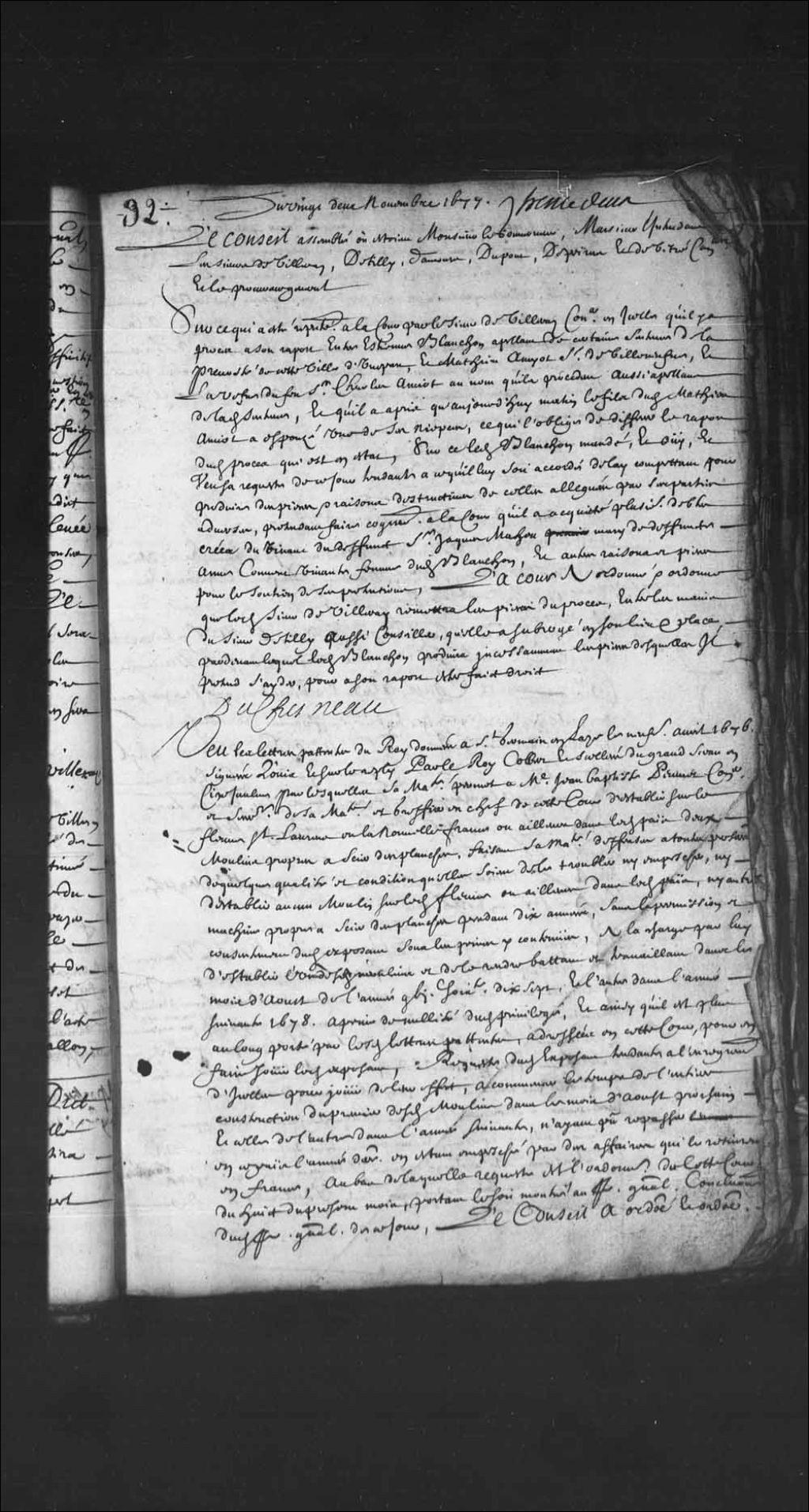 Transcription du texte avec orthographe modernisée : «Vu les lettres patentes du Roi données à Saint-Germain en Laie le neuvième avril 1676 signées Louis, et sur le repli par le Roi Colbert et scellées du grand sceau en cire jaune par lesquelles sa Majesté permet à maître Jean-Baptiste Peuvret conseiller et secrétaire de sa Majesté et greffier en chef de cette Cour d'établir sur le fleuve Saint-Laurent en la Nouvelle-France ou ailleurs dans ledit pays deux moulins propres à scier des planches, faisant sa Majesté défenses à toutes personnes de quelque qualité et condition qu'elles soient de le troubler ni empêcher ni d'établir aucun moulin sur ledit fleuve ou ailleurs dans ledit pays, ni autres machines propres à scier des planches pendant dix années sans la permission et consentement dudit exposant sous les peines y contenues, à la charge par lui d'établir l'un desdits moulins et de le rendre battant et travaillant dans le mois d'août de l'année mille six cent soixante-dix-sept et l'autre dans l'année suivante 1678, à peine de nullité dudit privilège, et ainsi qu'il est plus au long porté par lesdites lettres patentes adressées à cette Cour pour en faire jouir ledit exposant, requête dudit exposant tendante à l'enregistrement d'icelles pour jouir de leur effet, à commencer le temps de l'entière construction du premier desdits moulins dans les mois d'août prochain et celle de l'autre dans l'année suivante, n'ayant pu repasser en ce pays l'année dernière, en étant empêché par des affaires qui le retenaient en France, au bas de laquelle requête est l'ordonnance de cette Cour du huit du présent mois, portant le soit montré au procureur général, conclusions dudit procureur général de ce jour, le Conseil a ordonné et ordonne que lesdites lettres seront registrées pour jouir par ledit impétrant de l'effet et contenu en icelles, lui prorogeant sous le bon plaisir de sa Majesté le temps d'une année au lieu de celle qui est expirée, attendu qu'il n'a pu se rendre en ce pays que le 20e d'octobre dernier en ayant été empêché par ses affaires, à la charge néanmoins qu'il ne pourra empêcher de scier et faire scier des planches pour le travail des hommes, soit pour l'utilité des particuliers, soit pour en faire vente comme il se pratique en ce pays. DUCHESNEAU.»
