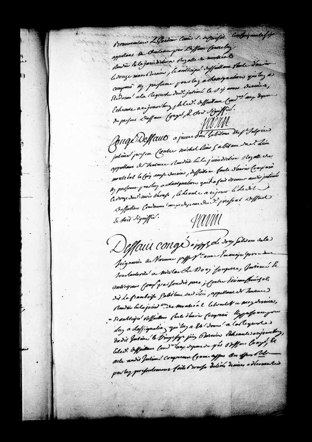Arrêt qui accorde défaut-congé à Joseph Ledoux, habitant de la seigneurie de Varennes, paroisse Sainte-Anne, émancipé, procédant sous l'autorité de Nicolas Ledoux, son père, contre Etienne Sénéchal dit Laframboise, habitant du même lieu et appelant de la sentence rendue en la Juridiction de Montréal, le 31 mai 1748