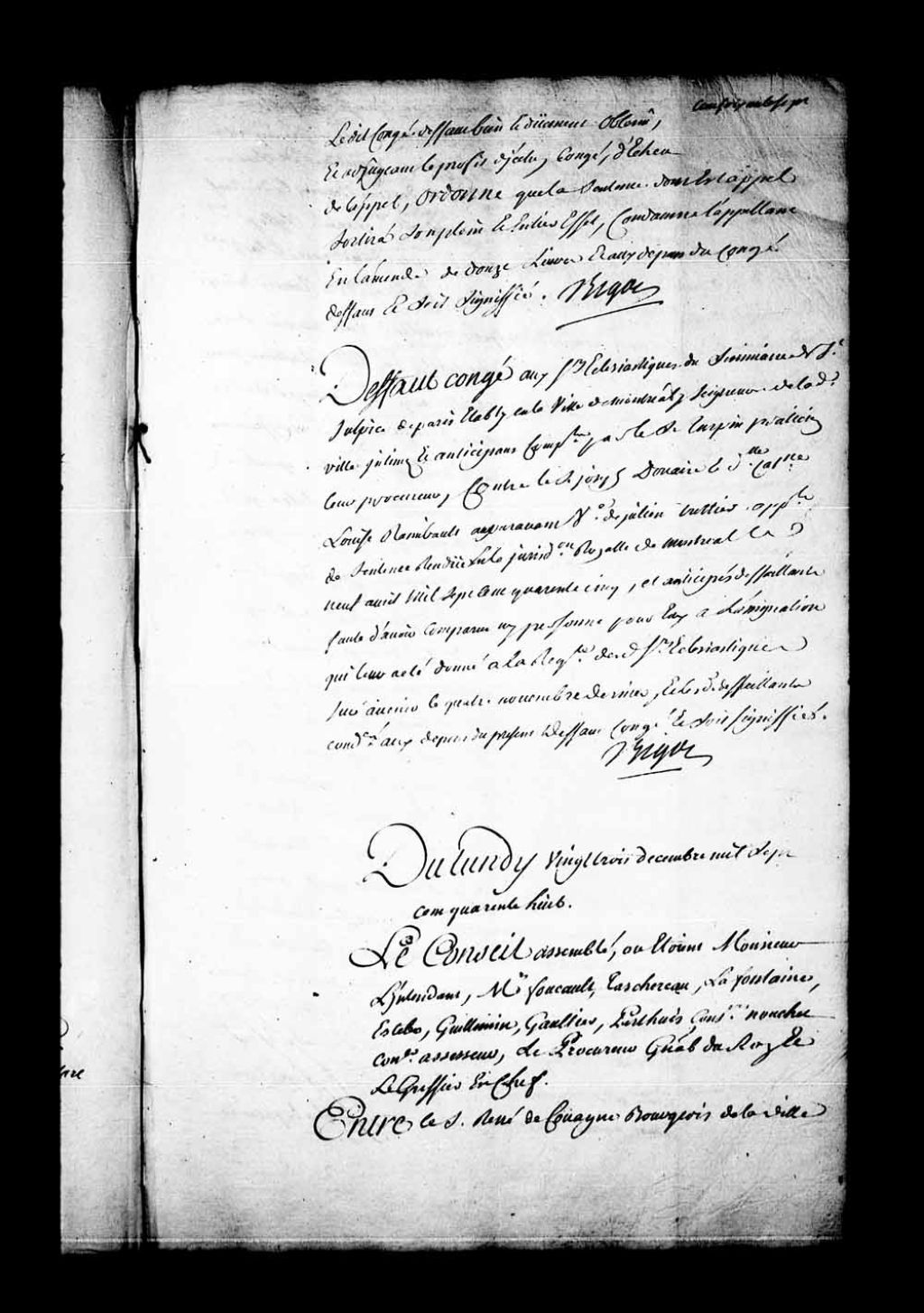 Appel mis à néant dans la cause entre René de Couagne, bourgeois de la ville de Montréal, au nom et comme époux de la demoiselle Pothier, tuteur des mineurs issus de leur mariage et en partie de feus Jean-Baptiste Pothier et sa femme, appelant de la sentence rendue en la Juridiction des Trois-Rivières, le 19 mars 1748, contre la veuve et les héritiers de Charles Auger, habitant de la Rivière-du-Loup. Le Conseil condamne la veuve et les héritiers de Charles Auger à payer à Couagne, aux dits noms, la somme de 223 livres, restant du billet en contestation avec les intérêts à compter du 8 mars 1748, 23 décembre 1748, Archives nationales à Québec, Fonds Conseil souverain, (03Q,TP1,S28,P20277).