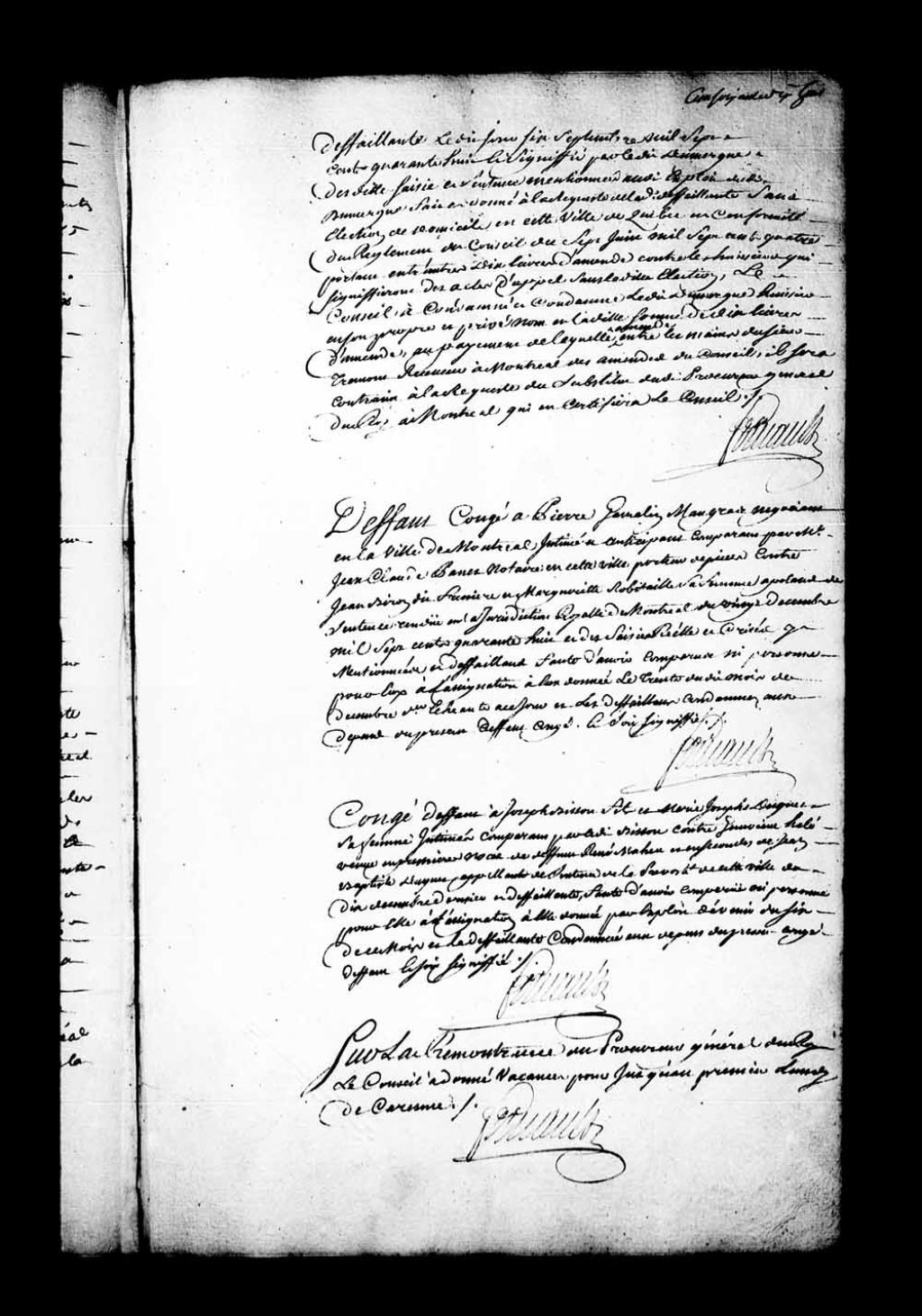Arrêt qui accorde défaut-congé à Pierre Gamelin Maugras, négociant en la ville de Montréal, contre Jean Biron dit Fresnière et Marguerite Robitaille, sa femme, appelants de la sentence rendue en la Juridiction de Montréal, le 20 décembre 1748