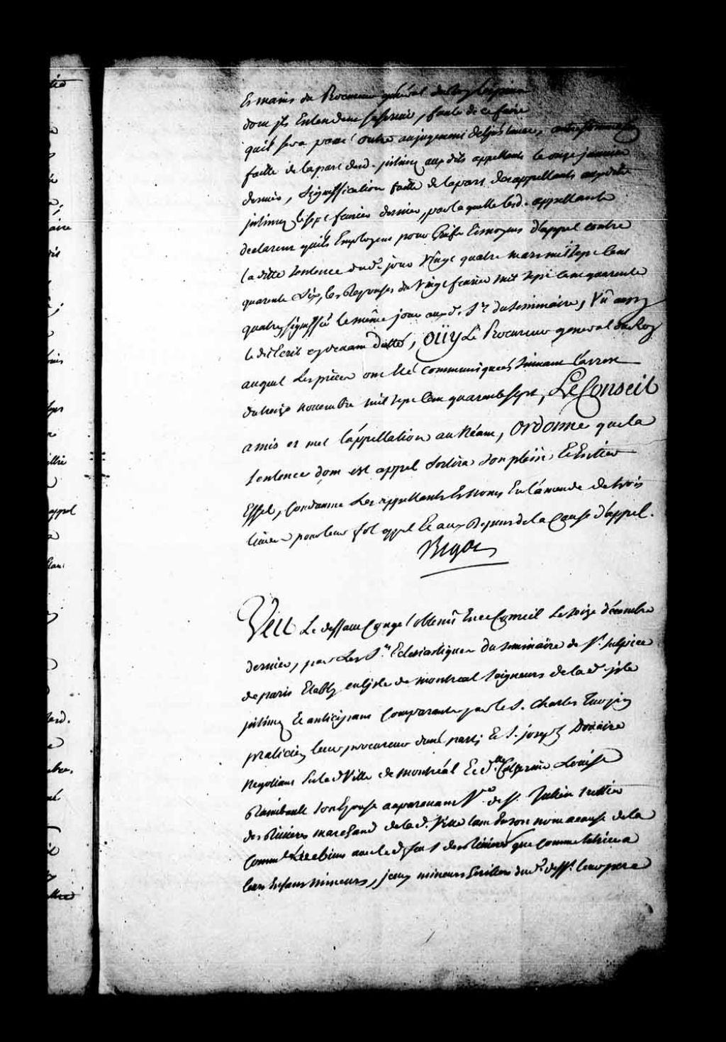 Arrêt qui déclare le défaut-congé obtenu en ce Conseil, le 16 décembre 1748, par les Sieurs Ecclésiastiques du Séminaire de Saint-Sulpice de Paris, établis en l'île de Montréal et seigneurs de la dite île, contre le sieur Joseph Douaire, négociant en la ville de Montréal, et damoiselle Catherine-Louise Raimbault, son épouse, auparavant veuve du sieur Julien Trottier des Rivières, marchand de Montréal, tant en son nom qu'en raison de la communauté de biens avec feu le sieur Rivière et comme tutrice à leurs enfants mineurs, héritier de leur père, bien et dûment obtenu. Le Conseil, adjugeant le profit du dit défaut, déclare le sieur Joseph Douaire et damoiselle Catherine-Louise Raimbault déchus de leur appel. Il est ordonné que la sentence en appel sortira son plein et entier effet. Le sieur Joseph Douaire et damoiselle Catherine-Louise Raimbault sont condamnés à 12 livres d'amende et aux dépens du présent défaut-congé, 24 mars 1749, Archives nationales à Québec, Fonds Conseil souverain, (03Q,TP1,S28,P20317).
