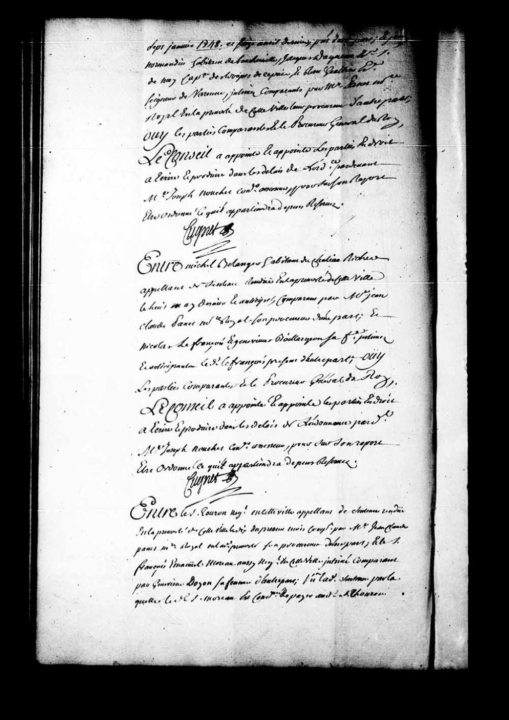 Appel mis à néant de la sentence rendue en la Prévôté de Québec, le 10 juin 1749, dans la cause entre le sieur Touron, négociant à Québec, représenté par maître Jean-Claude Panet, notaire royal en la Prévoté de Québec, son procureur, contre le sieur François Emmanuel Moreau, aussi négociant à Québec, représenté par sa femme Geneviève Doyon. Appel mis à néant en ce que la sentence a soldé le compte présenté par François Emmanuel Moreau; en ce que la pension de sieur Touron est portée jusqu'au 10 janvier 1749 à raison de 1 100 livres par année, et la pension de sa servante, du 28 juin au 10 décembre 1748, à raison de 40 sols par jour. Le Conseil ordonne que le compte sera réglé pour la pension de l'appelant jusqu'au 31 décembre 1748 sur le pied de 1 100 livres, et celle de la servante à raison de 300 livres par année