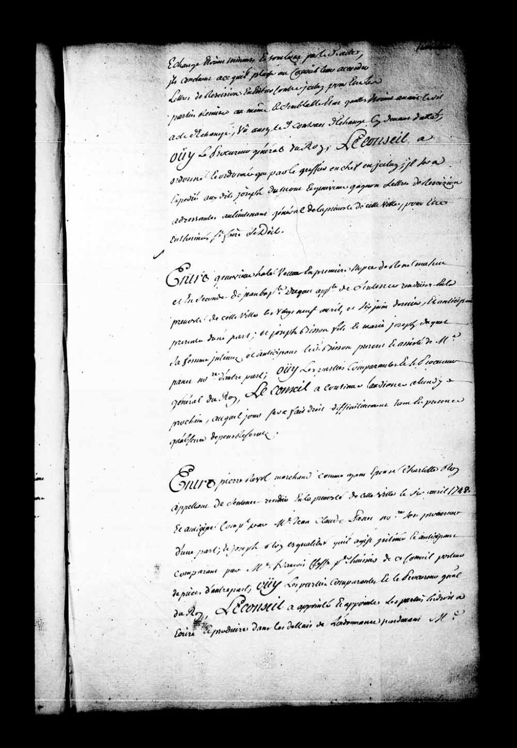 Arrêt qui continue l'audience à lundi prochain, auquel jour sera fait droit définitivement, tant en présence qu'absence, dans la cause entre Geneviève Hallé, veuve en premières noces de René Maheu, et en seconde de Jean-Baptiste Duquet, appelante des sentences rendues en la Prévôté de Québec, les 29 avril et 6 juin 1749, contre Joseph Bisson fils et Marie-Joseph Duquet, sa femme