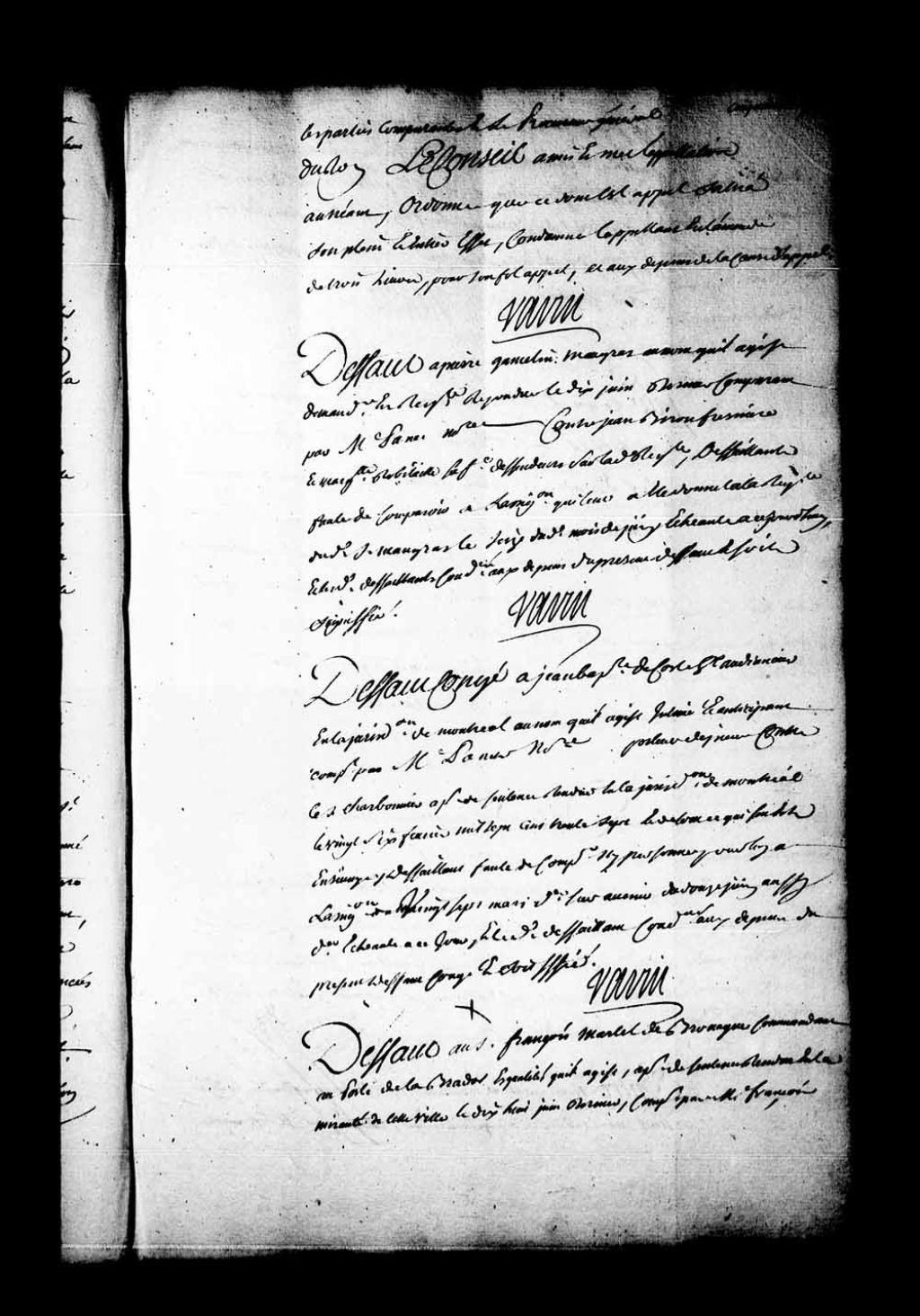Arrêt qui accorde défaut à Pierre Gamelin Maugras, au nom qu'il agit, demandeur en requête répondue le 10 juin 1749, contre Jean Biron Fresnière et Marguerite Robitaille, sa femme, défendeurs sur la dite requête
