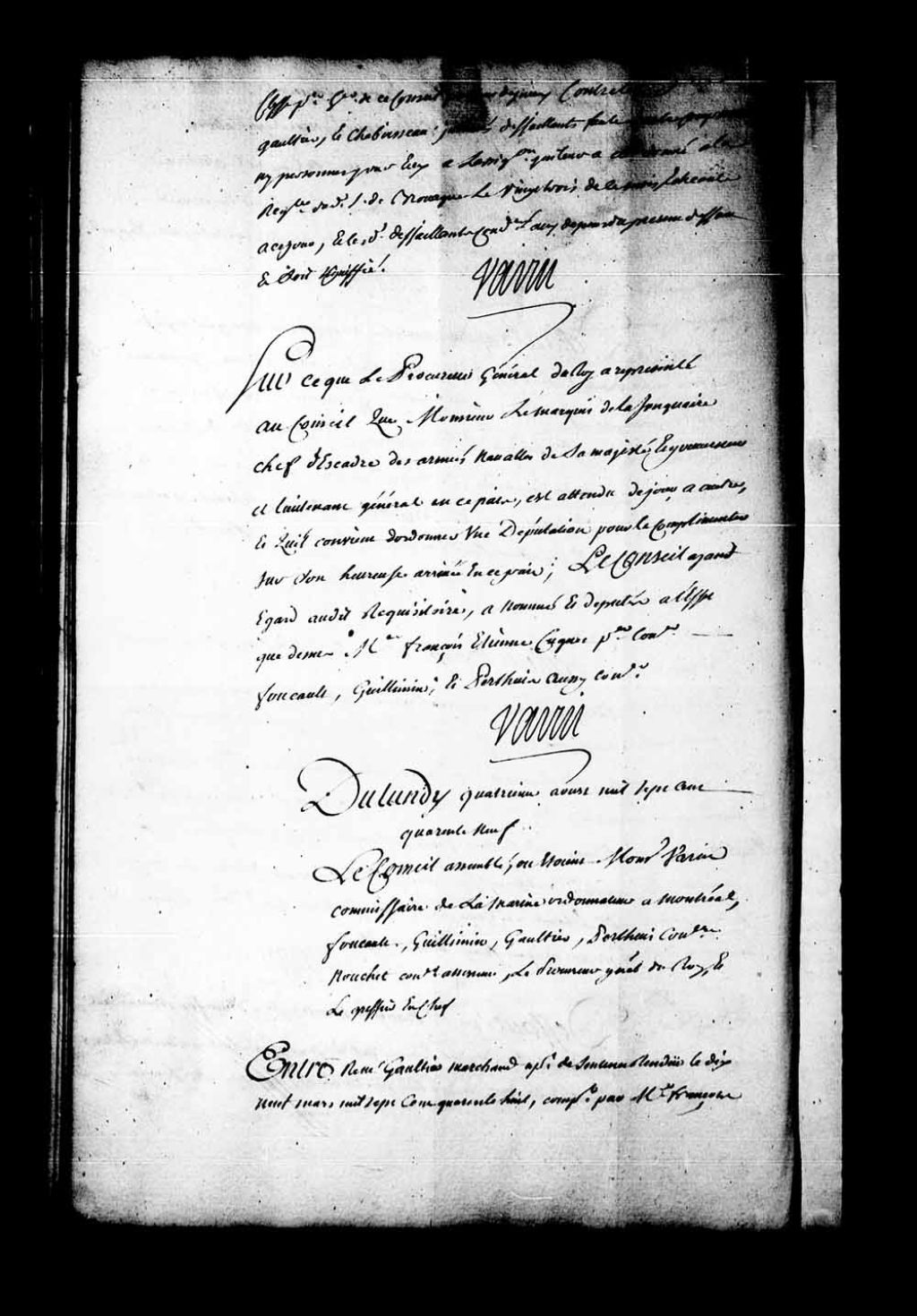 «Sur ce que le procureur général du Roi a représenté au Conseil que monsieur le Marquis de la Jonquière, chef d'escadre des armées navales de Sa Majesté, et gouverneur et lieutenant général en ce pays, est attendu de jour à autre, et qu'il convient d'ordonner une députation pour le complimenter sur son heureuse arrivée en ce pays, le Conseil a nommé et député, à cet effet, maître François-Etienne Cugnet, premier conseiller, et Messieurs Foucault, Guillimin et Perthuis, aussi conseillers»