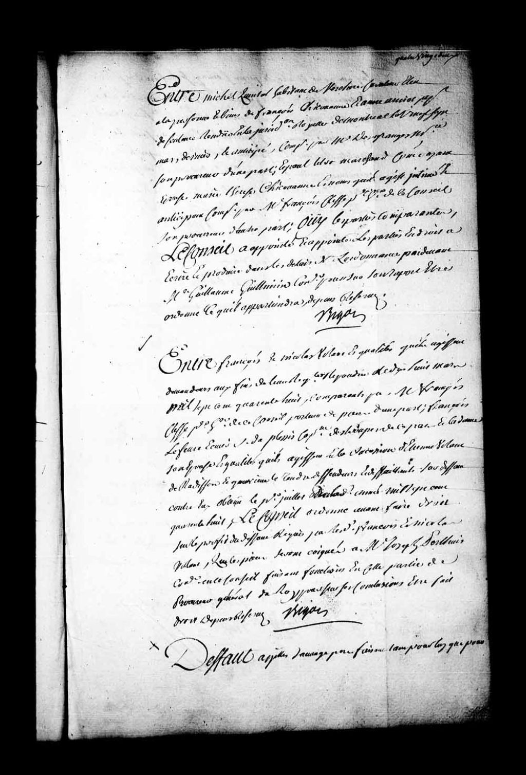 Arrêt qui ordonne, avant de faire droit, sur le profit du défaut requis par François et Nicolas Volant contre François Lefebvre Duplessis, capitaine dans les troupes, que les pièces du procès seront confiées à maître Joseph Perthuis, conseiller en ce Conseil, faisant l'office de procureur général du Roi, pour que dans ses conclusions puisse être fait droit