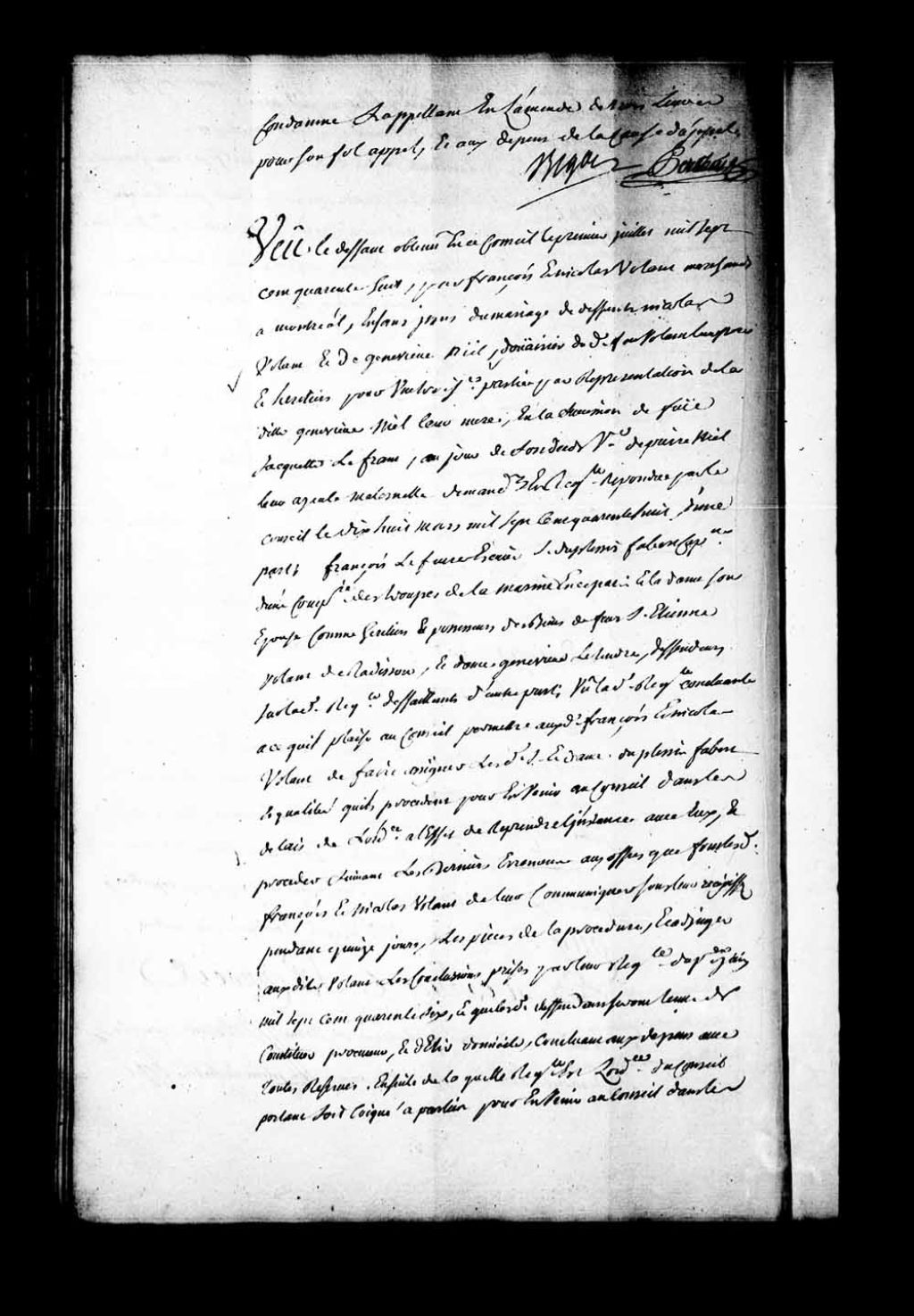 Arrêt qui déclare le défaut obtenu en ce Conseil, le 1er juillet 1748, par François et Nicolas Volant contre Pierre Lefebvre Duplessis Fabert, capitaine dans les troupes, bien et dûment obtenu. Le Conseil, adjugeant le profit du dit défaut, ordonne que l'instance d'entre les sieurs Volant et la dame feu Geneviève Letendre, veuve de Etienne Volant de Radisson, demeurera reprise avec la femme du dit Duplessis Fabert et que les parties procéderont suivant les derniers errements