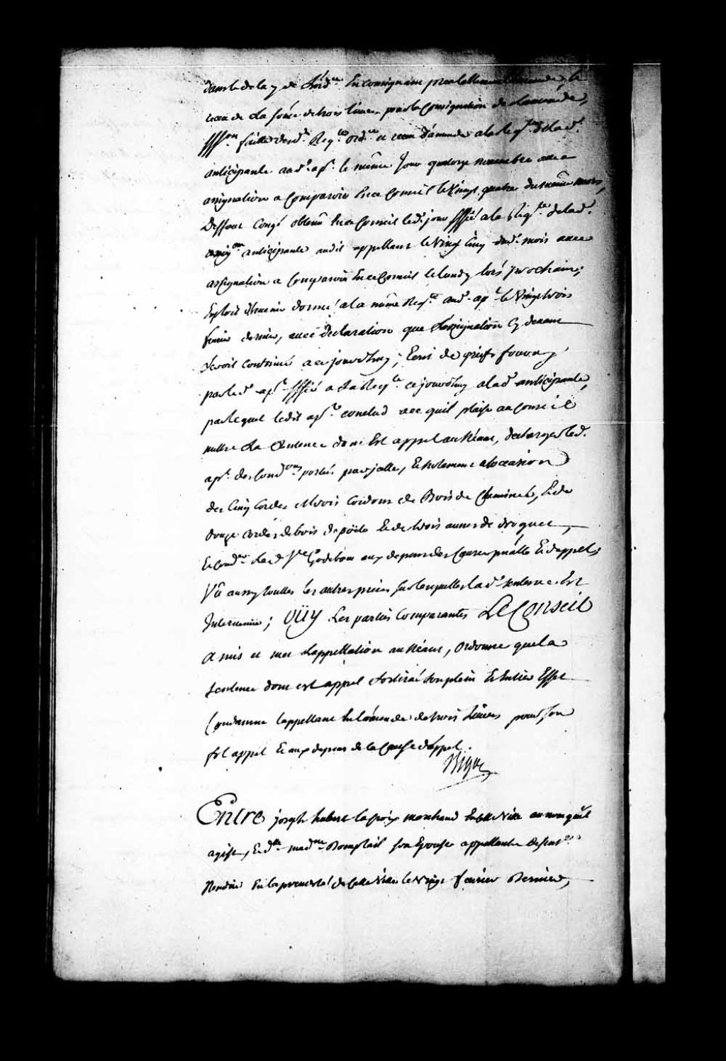 Arrêt qui continue l'audience à lundi prochain pour être fait droit définitivement, tant en présence qu'absence, dans la cause entre Joseph Hubert Lacroix, marchand en la ville de Québec, au nom qu'il agit, et Madeleine Domptail, son épouse, appelants de la sentence rendue en la Prévôté de Québec, le 20 février 1750, contre Geneviève Domptail, femme de Pierre Mallet, aussi au nom qu'elle agit, intimée, 2 mars 1750, Archives nationales à Québec, Fonds Conseil souverain, (03Q,TP1,S28,P20458).
