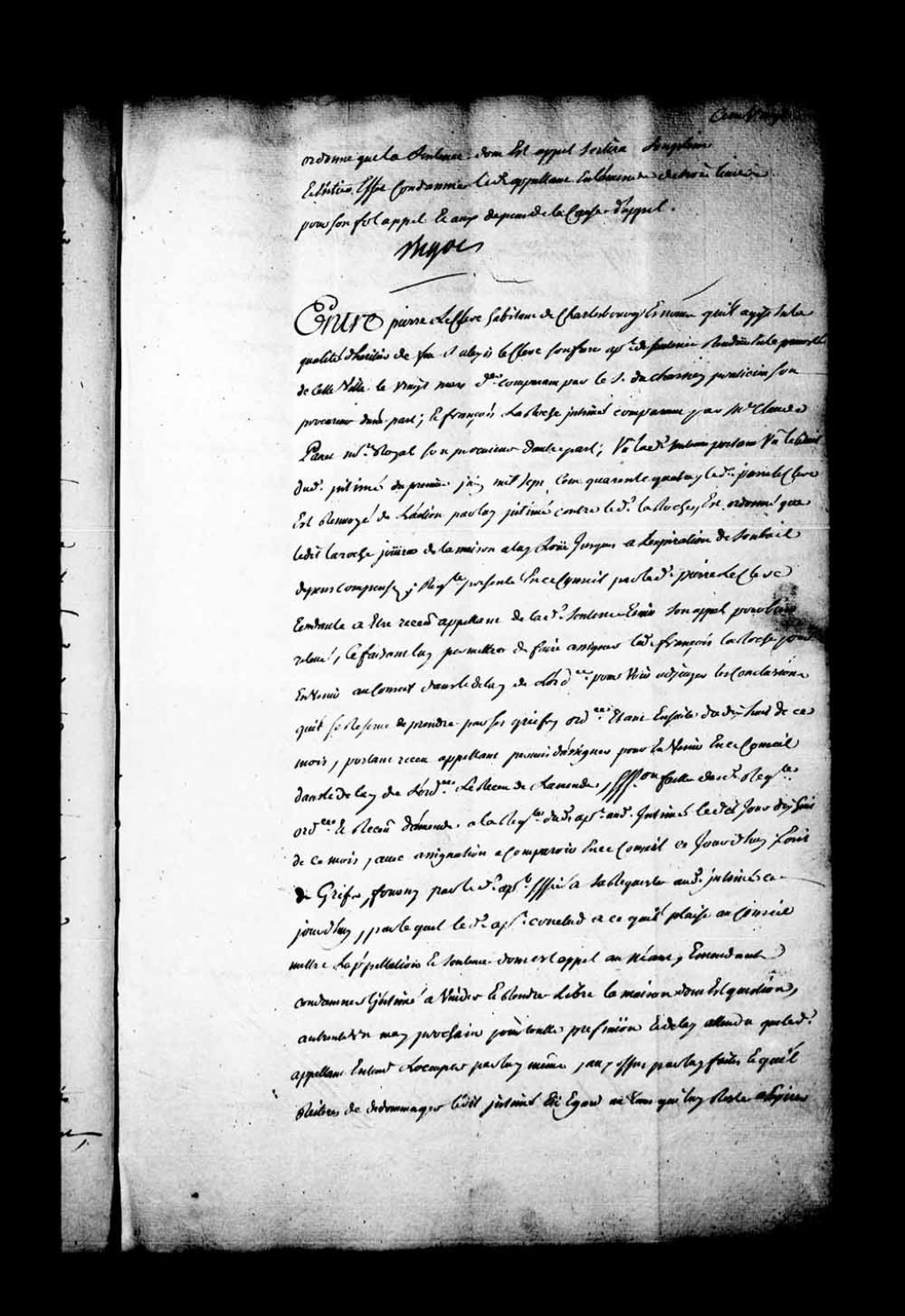 Appel mis à néant de la sentence rendue en la Prévôté de Québec, le 20 mars 1750, dans la cause entre Pierre Leclerc, habitant de Charlesbourg, agissant en son nom et en la qualité d'héritier de feu Alexis Leclerc, son frère, représenté par Jean-Claude Panet, notaire royal, son procureur, contre François Laroche. Le Conseil condamne François Laroche à vider et rendre la maison qu'il occupe, au 31 mai 1750, au dit Pierre Leclerc, à la charge par Pierre Leclerc d'occuper la dite maison par lui-même et de dédommager le dit François Laroche suivant ses offres, 27 avril 1750, Archives nationales à Québec, Fonds Conseil souverain, (03Q,TP1,S28,P20476).