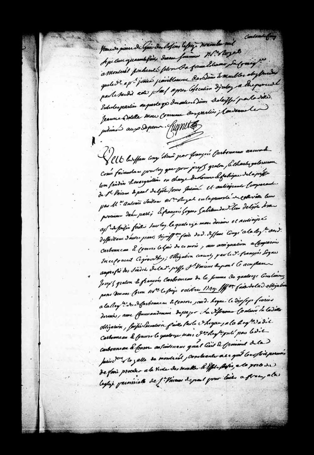 Arrêt qui déclare bien et dûment obtenu le défaut-congé accordé par ce Conseil en faveur de François Carbonneau, au nom et comme faisant tant pour lui que pour Joseph Graton et Charles Galerneau, tous syndics et marguilliers en charge de la paroisse de Saint-Vincent-de-Paul-de-l'île-Jésus, représenté par maître Jean-Antoine Saillant de Collégien, contre François Gogué, habitant du même lieu. Le Conseil, adjugeant le profit du dit défaut, a déchu l'appelant de son appel et ordonne que ce qui est en appel sortira son plein et entier effet. L'appelant est condamné à 12 livres d'amende et aux dépens du défaut-congé, 20 juillet 1750, Archives nationales à Québec, Fonds Conseil souverain, (03Q,TP1,S28,P20497).