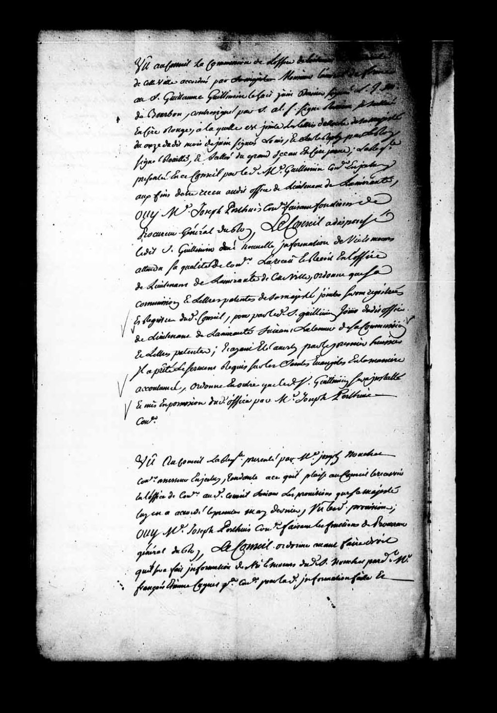 Arrêt qui ordonne, avant de faire droit, qu'il sera fait information des vie et moeurs de maître Joseph Nouchet qui vient de recevoir de Sa Majesté l'office de conseiller au Conseil Supérieur, 14 août 1750, Archives nationales à Québec, Fonds Conseil souverain, (03Q,TP1,S28,P20517).
