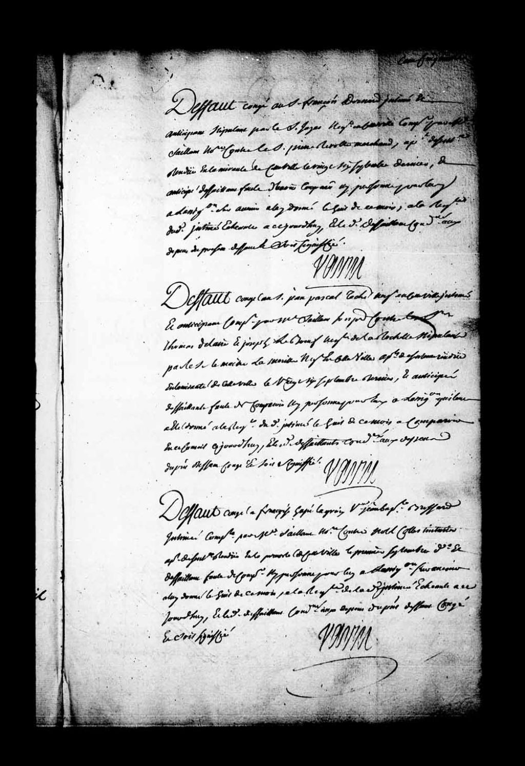 Arrêt qui accorde défaut au sieur Jean Pascal Taché, négociant en la ville de Québec, représenté par maître Jean-Antoine Saillant de Collégien, contre les sieurs Thomas Dallaire et Joseph Lebeuf, négociants en la ville de La Rochelle et appelants de la sentence rendue en l'Amirauté de Québec, le 26 septembre 1750, 12 octobre 1750, Archives nationales à Québec, Fonds Conseil souverain, (03Q,TP1,S28,P20523).