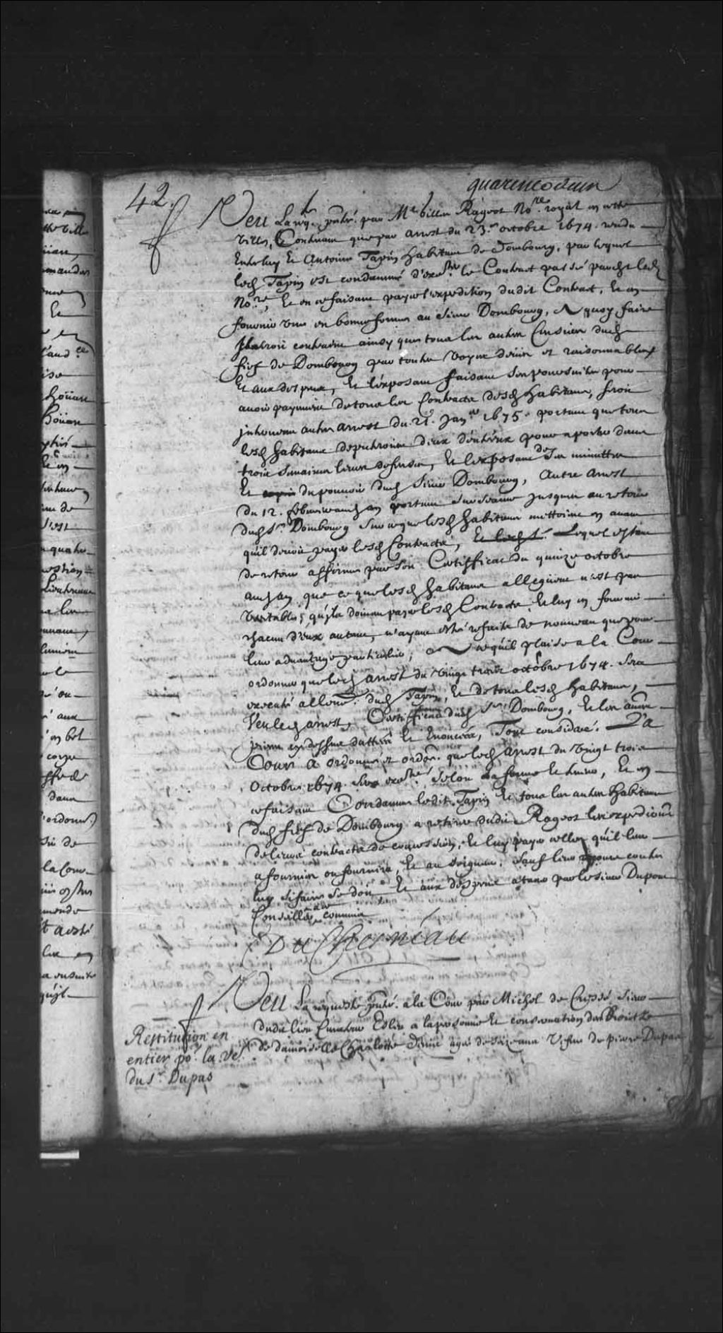 - Transcription du texte avec orthographe modernisée : «Vu la requête présentée à la Cour par Michel de Cressé sieur dudit lieu curateur élu à la personne et conservation des droits de demoiselle Charlotte Denis âgée de seize ans veuve de Pierre Dupas sieur Debraché, contenant que depuis le décès dudit défunt arrivé le jour de décembre dernier, ladite demoiselle Dupas se voyant dans un lieu écarté et dénuée de toute assistance et secours fut contrainte de se réfugier en cette nécessité chez l'exposant son beau-frère ou elle fit emmener un coffre et une petite cassette pleins de ce qui était à son usage et qui lui était le plus nécessaire, et quelque temps après ayant eu avis que le nommé Labarre son plus proche voisin, entre les mains duquel elle avait laissé tous les meubles, bestiaux, que provisions demeurées en sa maison, après le trépas de son mari en mésusait et dissipait une partie, fut obligée de faire transporter chez l'exposant ce qu'elle avait laissé entre les mains dudit Labarre, hormis les choses qui se pourront enlever qui sont demeurées eu la maison dudit défunt sieur Dupas, desquelles choses transportées l'exposant a fait sa déclaration au lieutenant général des Trois-Rivières, et d'un boeuf que ladite veuve fut obligée de vendre pour subvenir à ses nécessités sur le prix duquel elle a reçu la somme de trente livres, ayant affirmé vérité et prêté serment sur tout le contenu en ladite déclaration, requérant au surplus qu'inventaire fut fait des biens délaissés par ledit décès dudit sieur Dupas par acte du 22e du mois de mars, déclarant en outre qu'il prétendait renoncer pour ladite veuve à la communauté d'entre elle et sondit défunt mari, sur quoi elle aurait été renvoyée à se pourvoir en cette Cour pour être restituée et remise en l'état qu'elle était auparavant l'échéance des délais au-dedans desquels elle le devait faire, requérant l'exposant, audit nom, qu'il plaise à la Cour le déclarer être encore en état de renoncer pour ladite veuve, pour reprendre sur les biens de la succession dudit défunt ses conventions matrimoniales, habits, bagues, joyaux et habits de deuil, et ordonner qu'il sera incessamment procédé à la confection de l'inventaire desdits biens sans que l'on puisse tirer à conséquence ce qu'elle a été obligée de vendre pour subsister, ni de l'enlèvement qu'elle a été obligée de faire pour les mettre en sûreté, à cause de la nécessité du lieu, et la relever du défaut de formalités qui se pourraient n'avoir été gardées, ayant égard à la faiblesse de son âge, au peu d'expérience que son sexe a dans les affaires, et à l'éloignement et nécessité desdits lieux, ouï sur ce le procureur général. La Cour attendu qu'il n'y a encore de chancellerie en ce pays et sous le bon plaisir du Roi, a restitué et restitue ladite demoiselle veuve Dupas, ordonne que sondit curateur se retirera par devers le lieutenant général des Trois-Rivières, en la juridiction duquel sont situés les biens en question, lequel s'il lui appert de la minorité et des difficultés exposées les parties intéressées dûment appelées par-devant lui remettra ladite veuve en l'état qu'elle était auparavant l'échéance du délai au-dedans duquel les renonciations doivent être valablement faites, comme de fait la Cour l'a relevée et relève la mettant par le présent arrêt au même état qu'elle était auparavant ladite échéance du délai. DUCHESNEAU.»