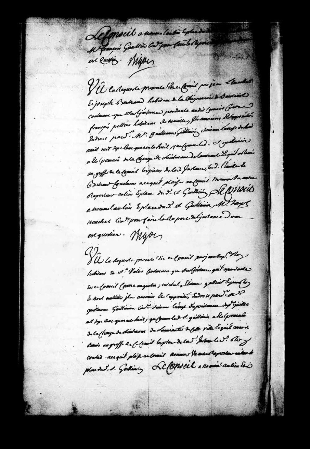 Arrêt qui nomme le sieur Joseph Nouchet, conseiller, au lieu et place de maître Guillimin, dans la cause entre Jean Léveillé et Joseph Bertrand, habitant de la seigneurie de d'Auteuil, contre François Pelletier, habitant de Neuville
