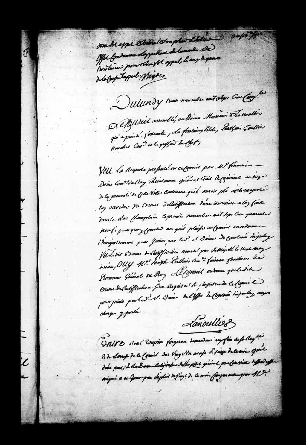 Arrêt qui ordonne que le brevet de ratification obtenu par maître François Daine, conseiller du Roi, lieutenant général civil et criminel de la Prévôté de Québec, d'une concession faite à lui près du lac Champlain, sera enregistrée dans les registres du Conseil, pour jouir par le dit Daine de l'effet du contenu de ce brevet