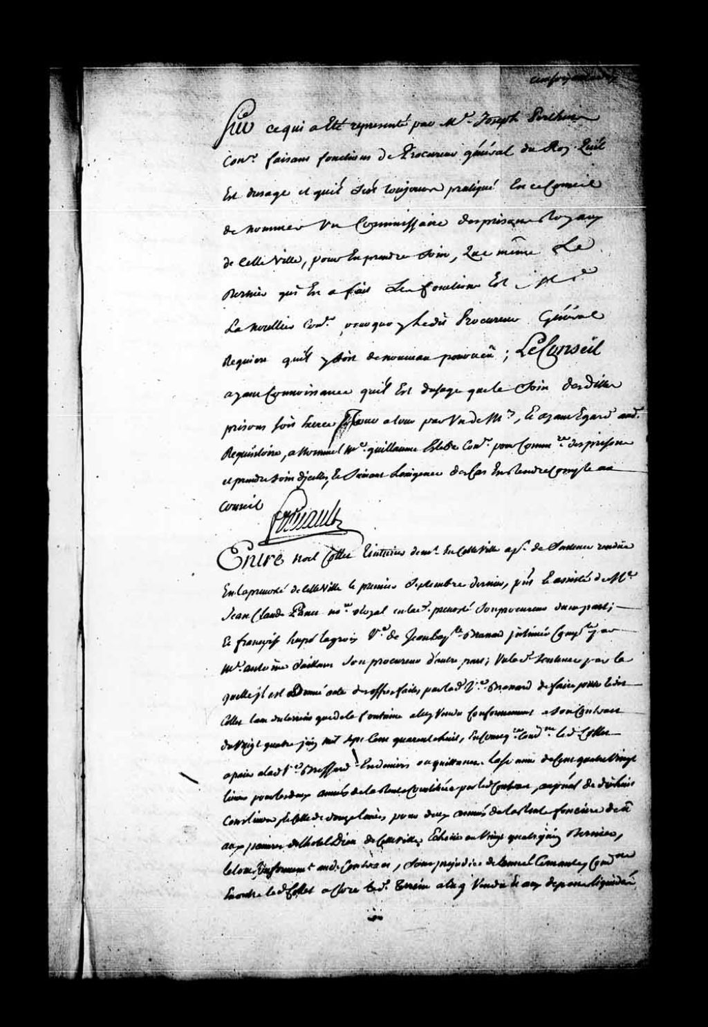 «Sur la représentation de maître Joseph Perthuis, faisant fonctions de procureur général du Roi, qu'il est d'usage en ce Conseil de nommer un commissaire des prisons royaux de cette ville pour en prendre soin, le Conseil a nommé Guillaume Estèbe, conseiller, pour commissaire des dites prisons, prendre soin de celles-ci, et suivant l'exigence du cas en rendre compte au Conseil»