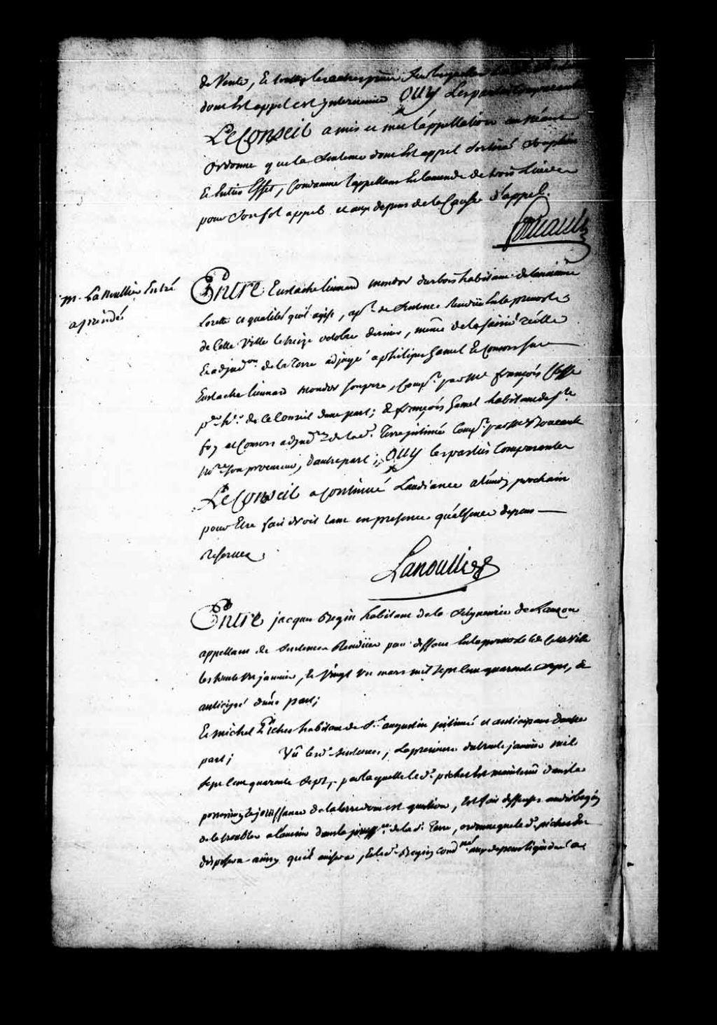Arrêt qui continue l'audience à lundi prochain pour être fait droit, tant en présence qu'absence, dans la cause entre Eustache Liénard Mondor Durbois, habitant de l'Ancienne Lorette, aux qualités qu'il agit, appelant de la sentence rendue en la Prévôté de Québec, le 13 octobre 1750, contre François Hamel, habitant de Sainte-Foy