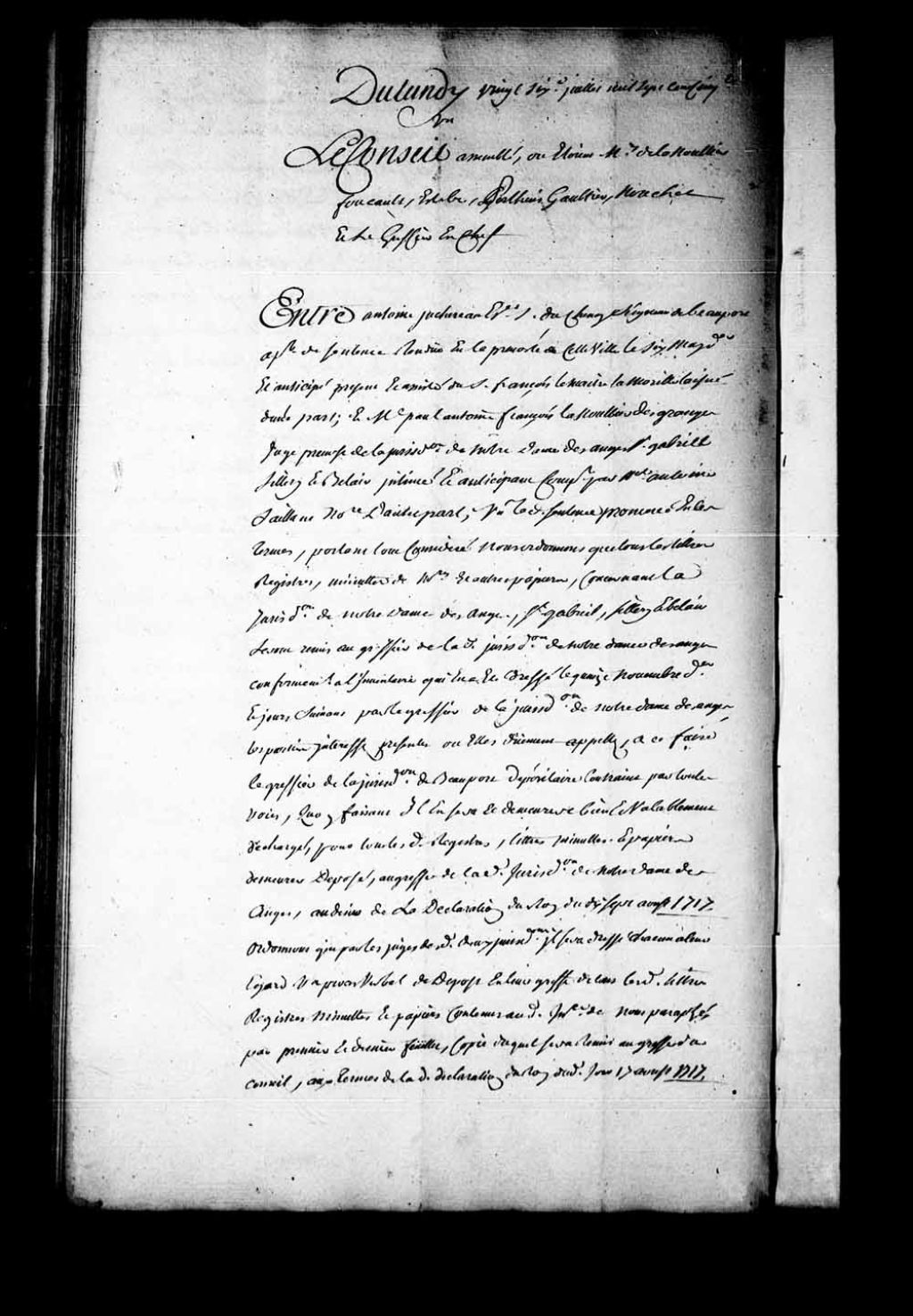 Appel mis à néant de la sentence rendue en la Prévôté de Québec, le 6 mai 1751, dans la cause entre Antoine Juchereau Duchesnay, seigneur de Beauport, contre Jean-Antoine-François Lanoullier des Granges, juge prévôt de la Juridiction de Notre-Dame-des-Anges, Saint-Gabriel, Sillery et Belair. Antoine Juchereau Duchesnay est condamné à l'amende de 3 livres pour son «fol appel» et aux dépens de la cause d'appel, 26 juillet 1751, Archives nationales à Québec, Fonds Conseil souverain, (03Q,TP1,S28,P20633).