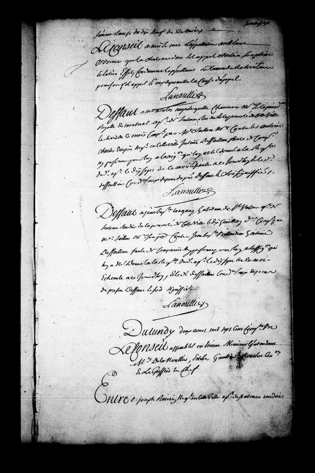 Appel mis à néant de la sentence rendue en la Prévôté de Québec, le 18 juin 1751, dans la cause entre Joseph Riverin, négociant à Québec, contre Joseph Hubert Lacroix, chirurgien demeurant en la ville de Québec. Le Conseil, évoquant le principal et y faisant droit, ordonne que la ligne de séparation entre les sieurs Riverin et Lacroix sera tirée et prolongée conformément au brevet de ratification de Sa Majesté du titre de concession de terrain de l'appelant du 1er mars 1793. En conséquence, il condamne Joseph Hubert Lacroix à rétablir à ses frais et dépens, dans le délai de huitaine, la partie du mur de clôture qu'il a fait abattre et ce, dans la même ligne où il était, 2 août 1751, Archives nationales à Québec, Fonds Conseil souverain, (03Q,TP1,S28,P20636).