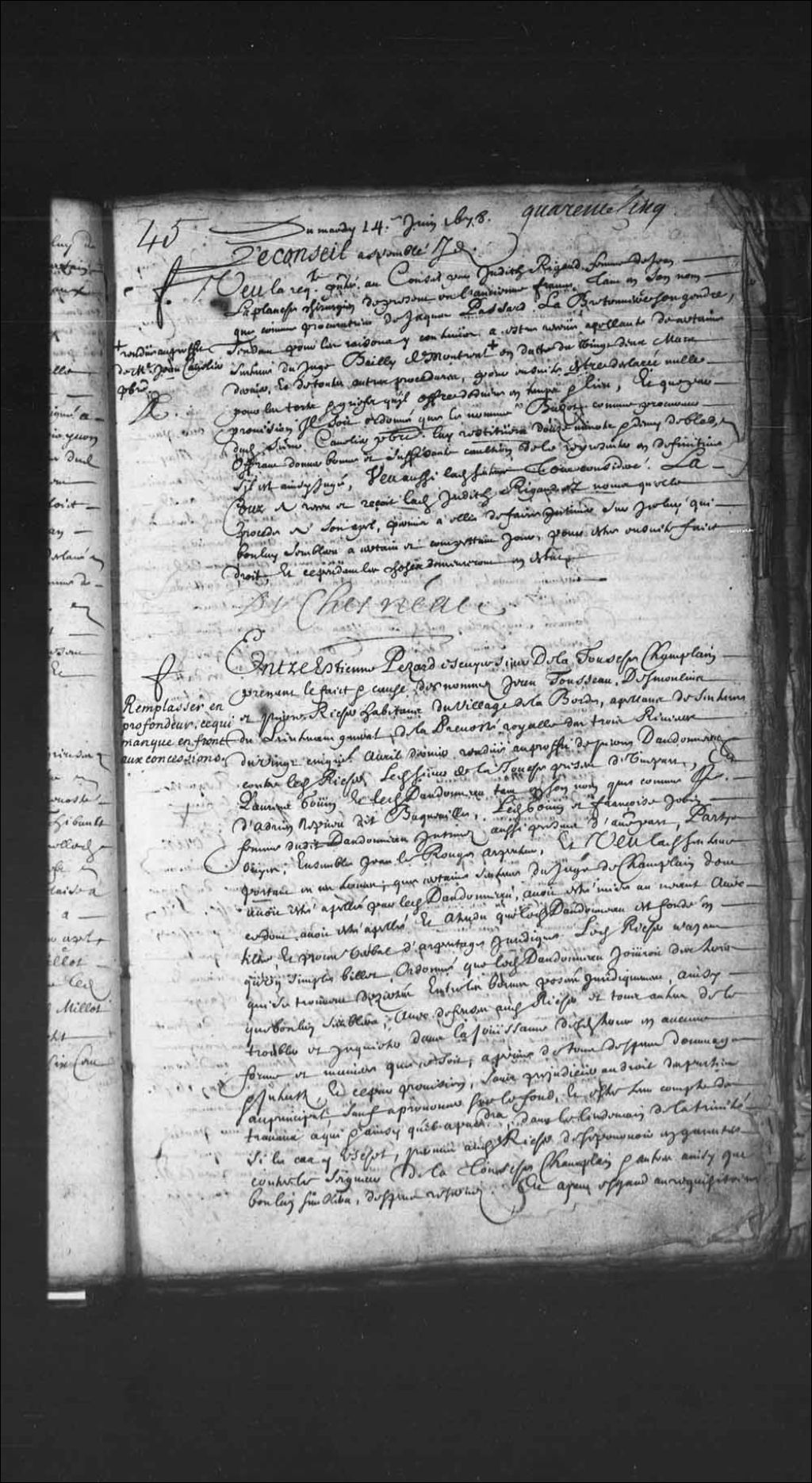 Transcription du texte avec orthographe modernisée : «Entre Etienne PEZARD écuyer sieur de Latouche Champlain, prenant le fait et cause des nommés Jean Tousseau, Desmoulins et Pierre Richer, habitant du village de LaBorde, appelant de sentence du lieutenant général de la prévôté royal des Trois-Rivières du vingt-cinquième avril dernier rendue au profit de Pierre Dandonneau contre ledit Richer, ledit sieur de LaTouche présent d'une part, et Laurent GOUIN et ledit DANDONNEAU tant en son nom que comme procureur de Adrien Neveu dit Baqueville, ledit Gouin et Françoise Jobin femme dudit Dandonneau intimés aussi présents d'autre part. Parties ouïes, ensemble Jean Lerouge arpenteur, et vu ladite sentence portant en ces termes: que certaine sentence du juge de Champlain dont avait été appelé par ledit Dandonneau avait été mise au néant avec ce dont avait été appelé, et attendu que ledit Dandonneau est fondé en titres et procès-verbal d'arpentage juridique, ledit Richer n'ayant qu'un simple billet, ordonné que ledit Dandonneau jouirait des terres qui se trouvent désertées entre les bornes posées juridiquement ainsi que bon lui semblera, avec défense audit Richer et tous autres de le troubler et inquiéter dans la jouissance desdites terres en aucune forme et manière que ce soit, à peine de tous dépens, dommages et intérêts, et ce par provision sans préjudicier au droit des parties au principal, sauf à prononcer sur le fonds, et être tenu compte des travaux à qui et ainsi qu'il appartiendra dans le lendemain de la Trinité si le cas y échoit, permis audit Richer de se pourvoir en garantie contre le seigneur de Latouche Champlain et autres ainsi que bon lui semblera, dépens réservés. Et ayant égard au réquisitoire du substitut du procureur du Roi, ordonne que le juge de Champlain serait assigné pour rendre raison de son prononcé par lequel il renvoie les habitants de Champlain à se pourvoir par-devant Monsieur l'intendant ou en cette Cour, que la grosse de sa sentence demeurera au greffe de ladite prévôté, et que la sentence de ladite prévôté serait exécutée nonobstant opposition ou appellations quelconques et sans y préjudicier, et ne pourront les qualités nuire ni préjudicier. Déclaration d'appel interjeté de ladite sentence en cette Cour par lesdits Tousseau, Desmoulins et Richer le quatorze mai dernier signé François Lorry, exploit aussi signé François Lorry portant assignation en cette Cour sur ledit appel auxdits Desmoulins, Richer et Tousseau, vu aussi ladite sentence du juge de Champlain en date du dix-huit avril dernier, requête d'appel d'icelle par ledit Dandonneau par-devant ledit lieutenant général, et ordonnance étant ensuite en date du vingtième dudit mois avec les exploits d'assignation donnés sur icelui aux dit Tousseau et Desmoulins le lendemain signés Adhémar, contrat passé par sieur Sévérin Ameau notaire royal aux Trois-Rivières en date du dix-sept mars 1665 par lequel ledit sieur de Latouche donne et concède audit Dandonneau deux arpents de terre de front sur quarante de profondeur dans les terres, procès-verbal d'arpentage fait de ladite concession en date du quatorze mars dernier signé J. Lerouge. Requête aujourd'hui présentée à la Cour par ledit Gouin et par la femme dudit Dandonneau les dit nom, ouï le sieur procureur général en ses conclusions, tout considéré, la Cour a mis et met l'appel et sentence dont était appelé au néant sans amende, et sans avoir égard à la sentence du juge de Champlain, du consentement dudit sieur de Latouche, l'a condamné et condamne fournir aux intimés, de proche en proche à la fin de leur profondeur de quarante arpents ce qui leur manque, leur longueur n'étant fournie, suivant et au désir dudit procès-verbal d'arpentage, à la charge néanmoins de laisser par eux jouir lesdits appelants du fruit des travaux qu'ils ont faits à la fin desdits quarante arpents de profondeur pendant le temps et aux termes et conditions portées par le règlement de cette Cour du onze mai 1676, article. vingt-six, et attendu que ledit Dandonneau a fait semer cette année sur la terre mise en valeur par ledit Desmoulins, ordonne que la récolte du grain qui s'en fera sera partagée par moitié, la semence préalablement reprise. Condamne en outre ledit sieur de Latouche aux dépens à taxer. Et faisant droit sur les conclusions dudit sieur procureur général fait défense ladite Cour an lieutenant général des Trois-Rivières et au juge de Champlain de prononcer à l'avenir dans les formes dont ils se sont servis, et audit François Lorry de donner à l'avenir aucune assignation en cette Cour où ailleurs, soit sur appellations, anticipations et dépositions qu'il ne lui apparaîtra en avoir auparavant été ordonné à peine d'interdiction et des dépens, dommages et intérêts des parties. DUCHESNEAU.»