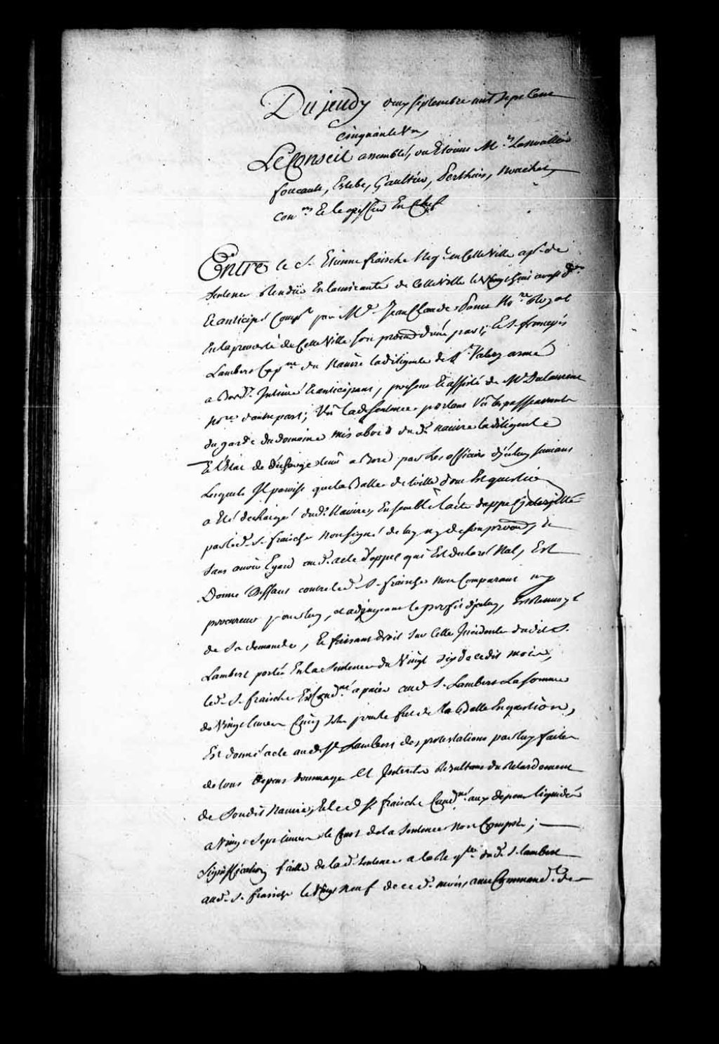 Appel mis à néant de la sentence rendue en l'Amirauté de Québec, le 28 août 1751, dans la cause entre Etienne Fraische, négociant en la ville de Québec, contre François Lambert, capitaine du navire «La diligence de Saint-Valéry», armé à Bordeaux. Fraische est condamné à l'amende de 3 livres pour son «fol appel» et aux dépens de la cause d'appel, 2 septembre 1751, Archives nationales à Québec, Fonds Conseil souverain, (03Q,TP1,S28,P20646).