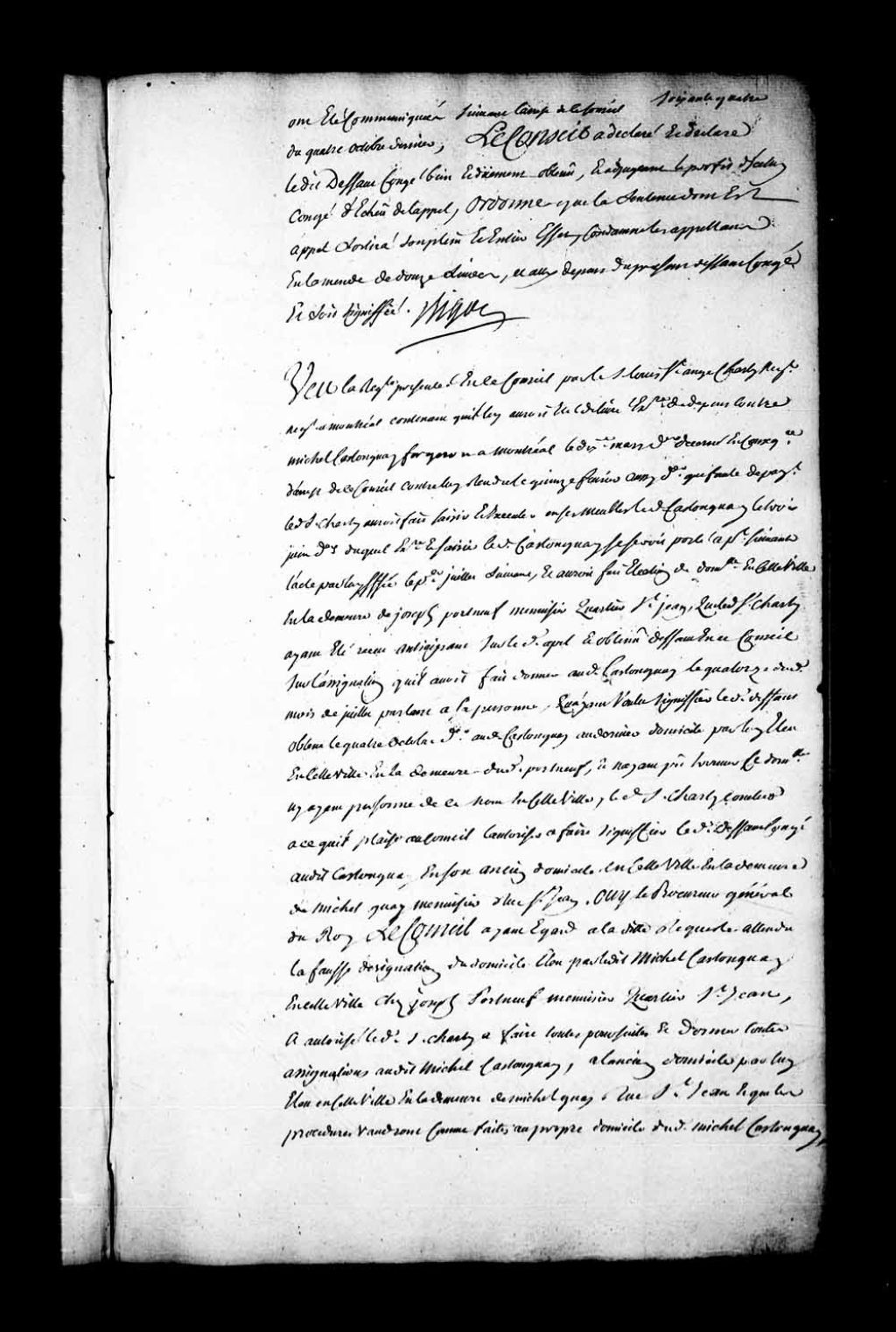Arrêt dans la cause entre Louis Saint-Ange Charly, négociant à Montréal, contre Michel Castonguay, forgeron de Montréal. Le Conseil ayant égard à la requête du sieur Saint-Ange Charly, attendu la fausse désignation du domicile élu par le dit Michel Castonguay, à Québec, chez Joseph Portneuf, menuisier situé dans le quartier Saint-Jean, a autorisé le dit sieur Charly Saint-Ange à faire toutes poursuites et assignations au sieur Castonguay, à l'ancien domicile par lui élu en cette ville en la demeure de Michel Guay située sur la rue Saint-Jean