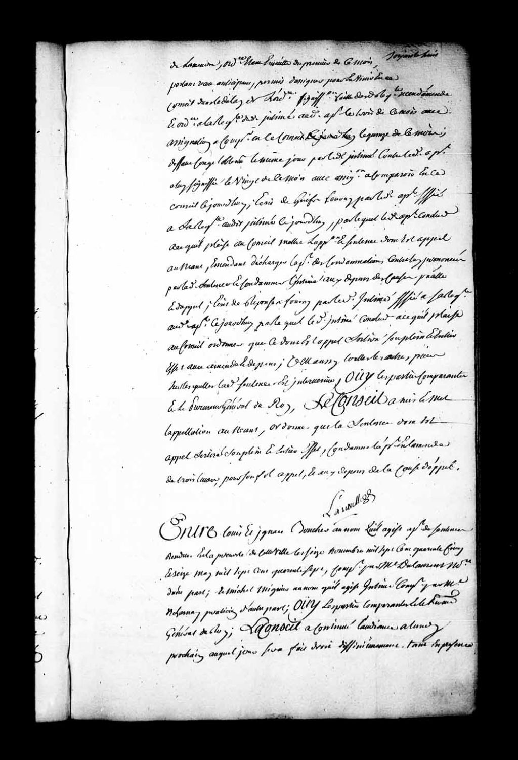 Arrêt qui continue l'audience à lundi prochain auquel jour sera fait droit définitivement, tant en présence qu'absence, dans la cause entre Louis et Ignace Boucher, au nom qu'ils agissent, appelants des sentences rendues en la Prévôté de Québec, les 16 novembre 1745 et 16 mai 1747, contre Michel Mignier, au nom qu'il agit, 29 novembre 1751, Archives nationales à Québec, Fonds Conseil souverain, (03Q,TP1,S28,P20678).