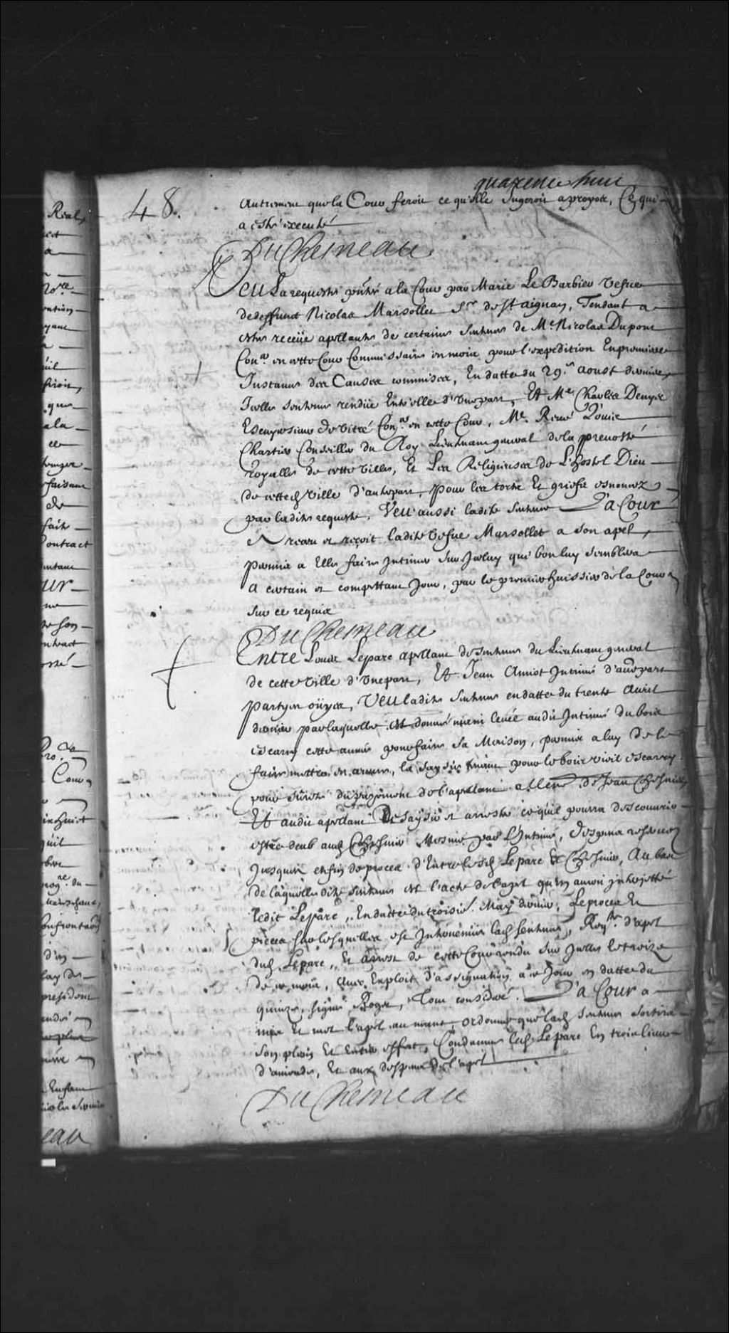 Transcription du texte avec orthographe modernisée : «Vu la requête présentée à la Cour par Marie Le Barbier veuve de défunt Nicolas Marsollet sieur de Saint-Aignan, tendante à être reçue appelante de certaine sentence de maître Nicolas Dupont conseiller en cette Cour commissaire en mois pour l'expédition en première instance des causes commises, en date du 29e août dernier, icelle sentence rendue entre elle d'une part et maître Charles Denis écuyer sieur de Vitré conseiller en cette Cour, maître René Louis Chartier conseiller du Roi, lieutenant général de la prévôté royal de cette ville, et les religieuses de l'Hôtel-Dieu de cette ville d'autre part, pour les torts et griefs énoncés par ladite requête, vu aussi ladite sentence, la Cour a reçu et reçoit ladite veuve Marsollet à son appel, permis à elle faire intimer sur icelui qui bon lui semblera à certain et compétent jour, par le premier huissier de la Cour sur ce requis. DUCHESNEAU.»