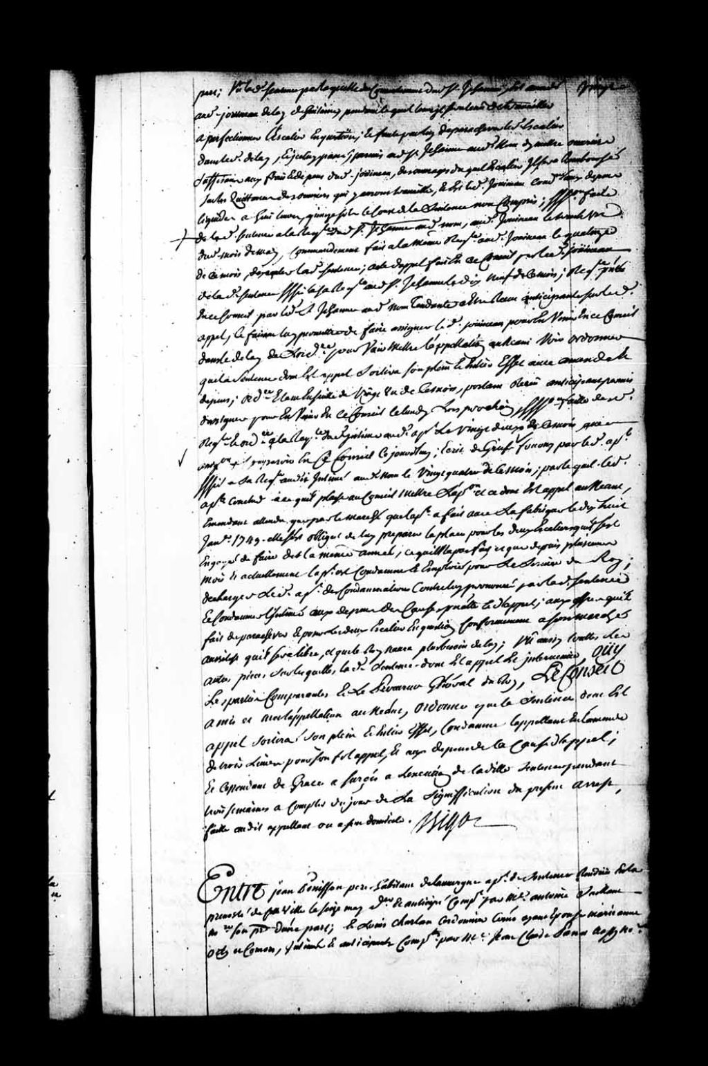 Arrêt qui appointe les parties en droit à écrire et produire, dans les délais de l'ordonnance, devant Joseph Perthuis, conseiller, pour que dans son rapport puisse être fait droit ainsi qu'il appartiendra dans la cause entre Jean Penisson père, habitant de l'Auvergne et appelant de la sentence rendue en la Prévôté de Québec, le 16 mai 1752, contre Louis Charland, cordonnier, comme époux de Marie-Anne Orty, 26 juin 1752, Archives nationales à Québec, Fonds Conseil souverain, (03Q,TP1,S28,P20763).